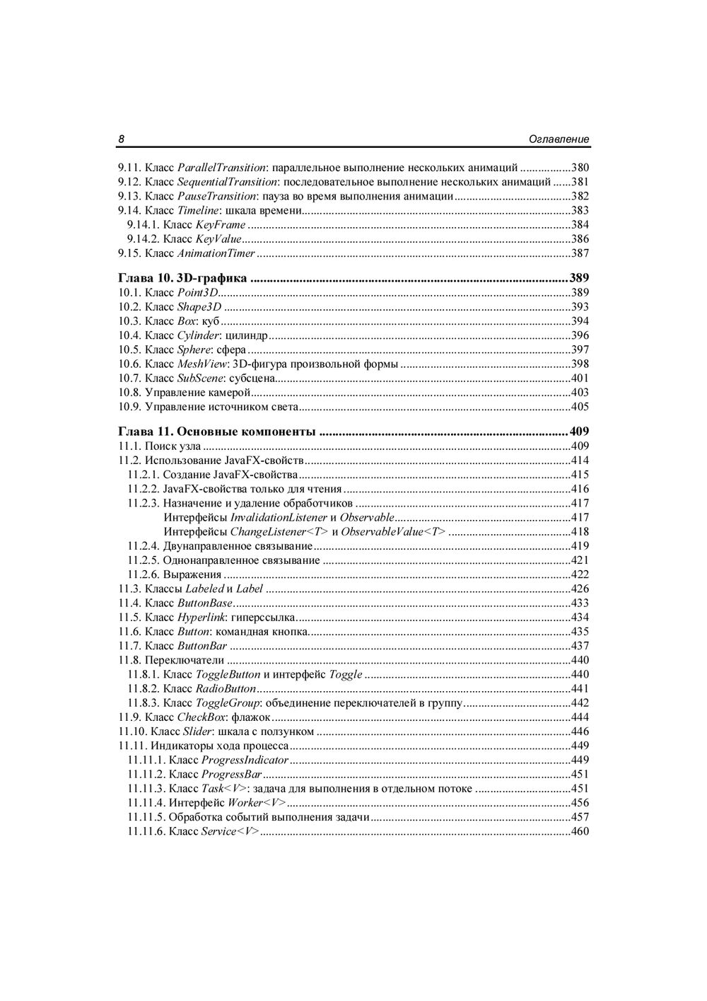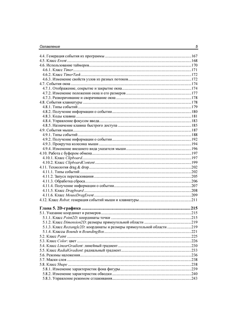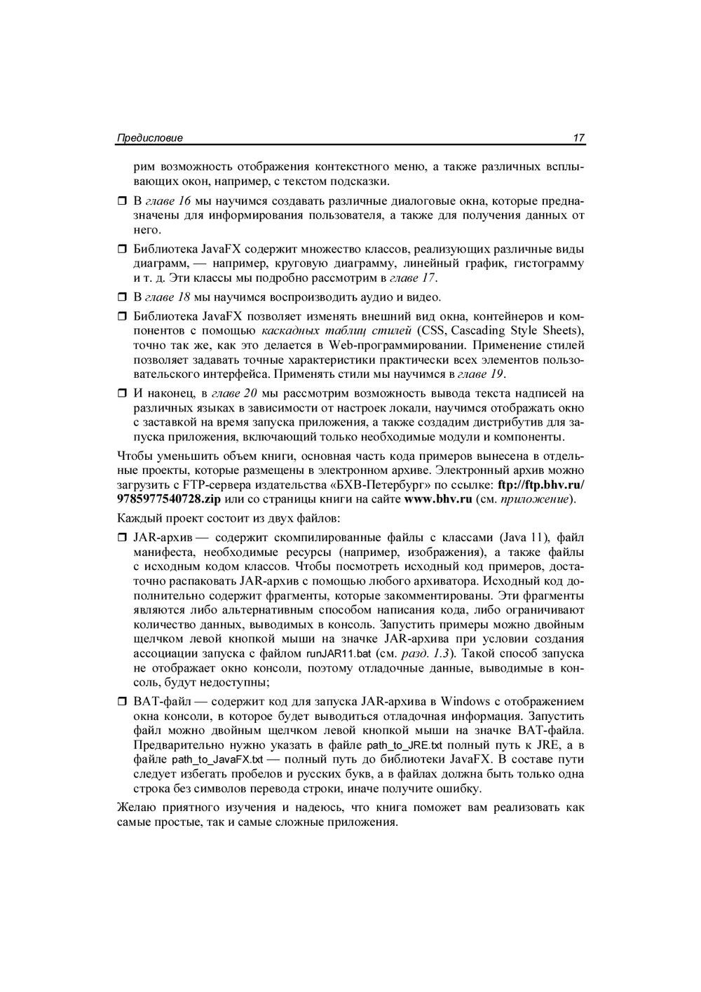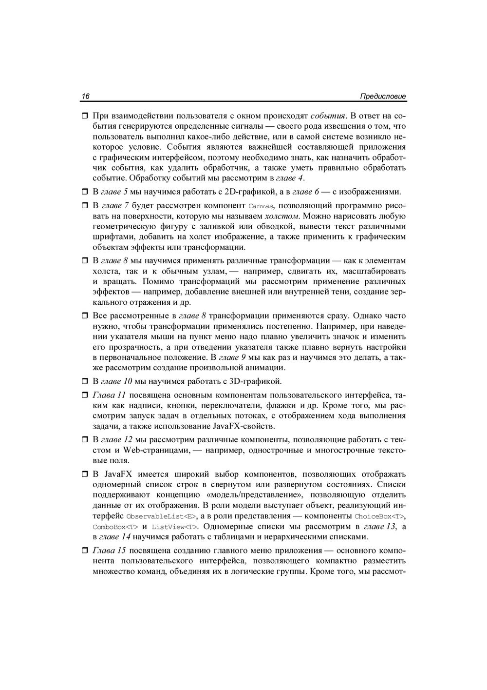 Описываются базовые возможности библиотеки JavaFX, позволяющей создавать приложения с графическим интерфейсом на языке Java. Рассматриваются способы обработки событий, управление свойствами окна, создание формы с помощью программы Scene Builder, а также все основные компоненты (кнопки, текстовые поля, списки, таблицы, меню и др.) и варианты их размещения внутри окна. Описаны трансформации и эффекты, графики и диаграммы, аудио и видео, стили JavaFX CSS. Книга ориентирована на тех, кто уже знаком с языком программирования Java и хотел бы научиться разрабатывать оконные приложения, насыщенные графикой, анимацией и интерактивными элементами. Большое количество практических примеров помогает начать разработку самостоятельно. Весь материал тщательно подобран, хорошо структурирован и компактно изложен, что позволяет использовать книгу как удобный справочник. Электронный архив с примерами находится на сайте издательства.