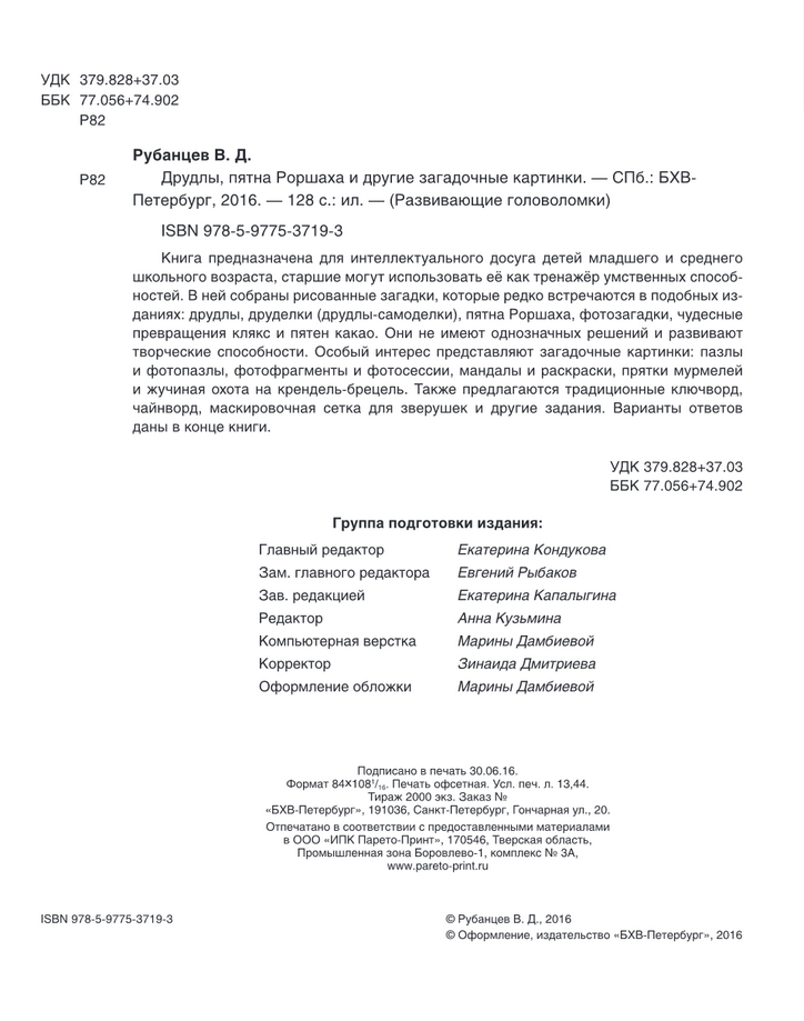Книга предназначена для интеллектуального досуга детей младшего и среднего школьного возраста, старшие могут использовать её как тренажёр умственных способностей. В ней собраны рисованные загадки, которые редко встречаются в подобных изданиях: друдлы, друделки (друдлы-самоделки), пятна Роршаха, фотозагадки, чудесные превращения клякс и пятен какао. Они не имеют однозначных решений и развивают творческие способности. Особый интерес представляют загадочные картинки: пазлы и фотопазлы, фотофрагменты и фотосессии, мандалы и раскраски, прятки мурмелей и жучиная охота на крендель-брецель. Также предлагаются традиционные ключворд, чайнворд, маскировочная сетка для зверушек и другие задания. Варианты ответов даны в конце книги.