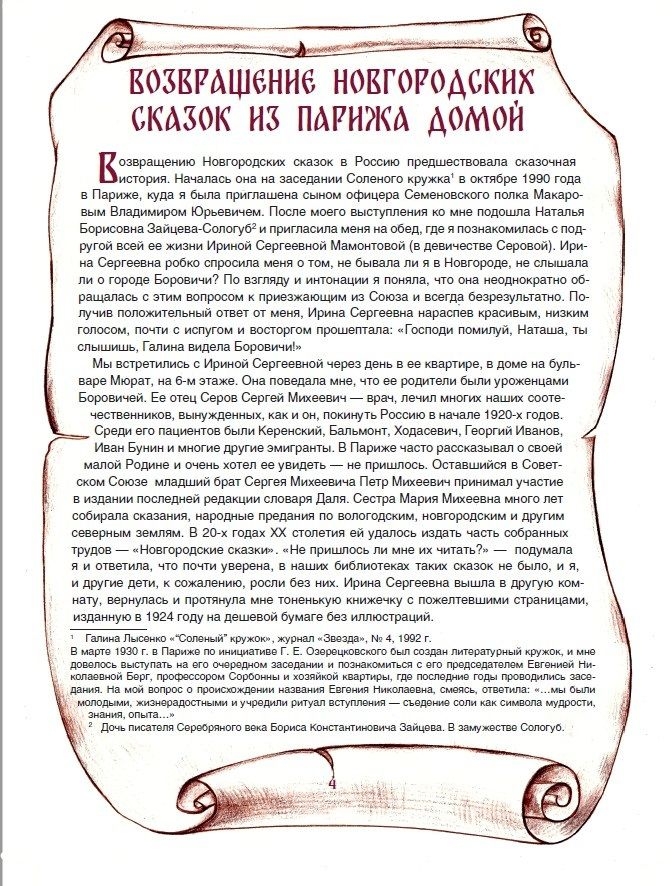 Сказки, представленные в книге, записаны со слов крестьян Тихвинского, Устюженского и Боровичского уездов Новгородской губернии в начале XX века. Бережная запись сохранила красоту народного говора Северной Руси и крестьянский юмор. Издание богато проиллюстрировано и дополнено картой-игрой, которая познакомит детей с Новгородской землей.