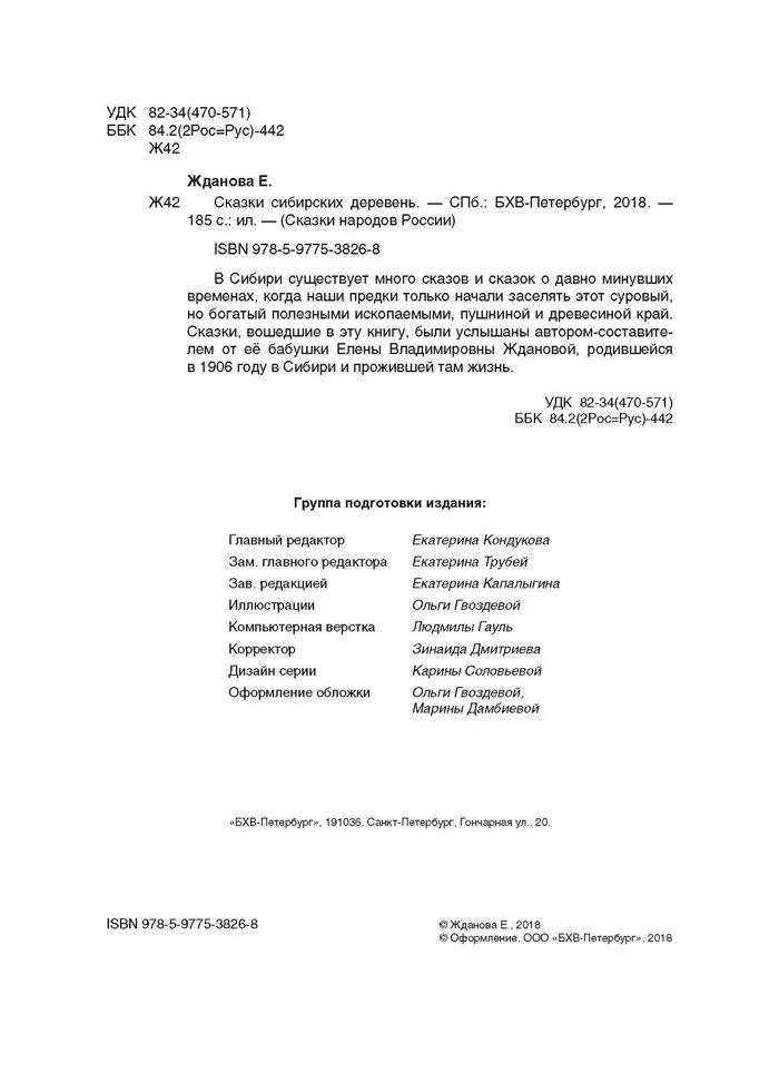 В Сибири существует много сказов и сказок о давно минувших временах, когда наши предки только начали заселять этот суровый, но богатый полезными ископаемыми, пушниной и древесиной край. Сказки, вошедшие в эту книгу, были услышаны автором-составителем от её бабушки Елены Владимировны Ждановой, родившейся в 1906 году в Сибири и прожившей там жизнь.