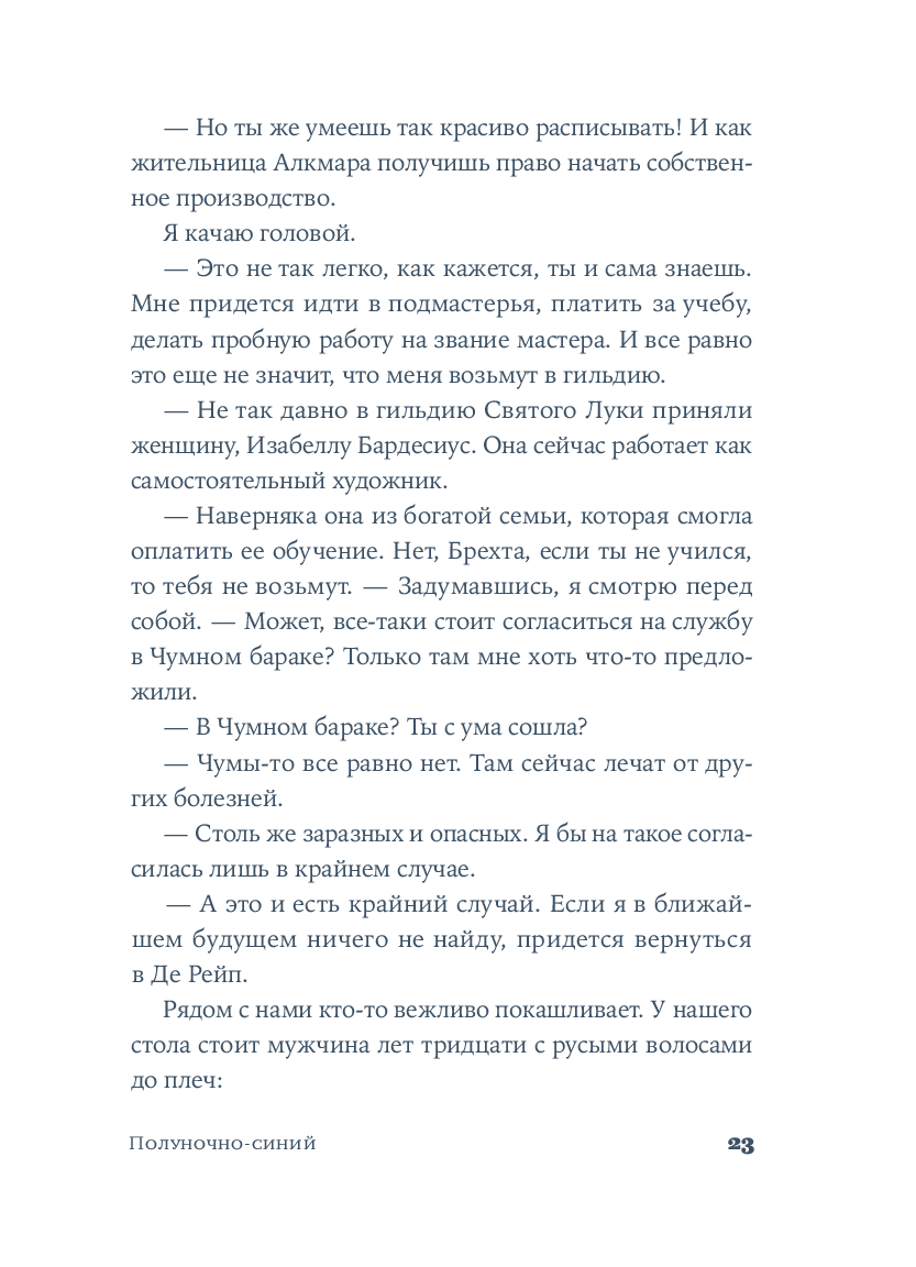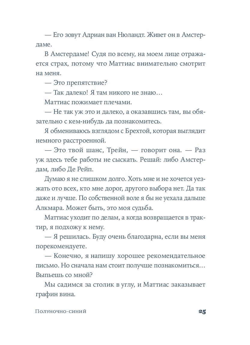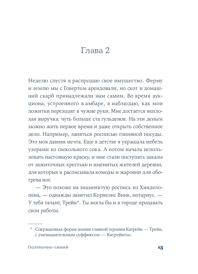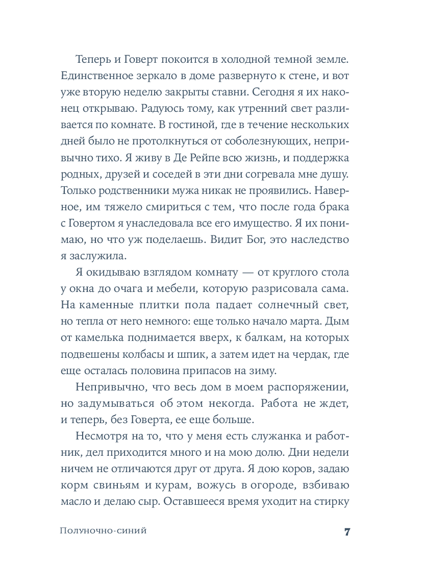 Среди узких мощеных улиц и живописных каналов, в эпоху Рембрандта и Вермеера разворачивается захватывающая история одаренной художницы. Катрейн теряет и вновь обретает свой голос, учится верить людям и рисует сине-белый мир, в котором чудо становится возможным.