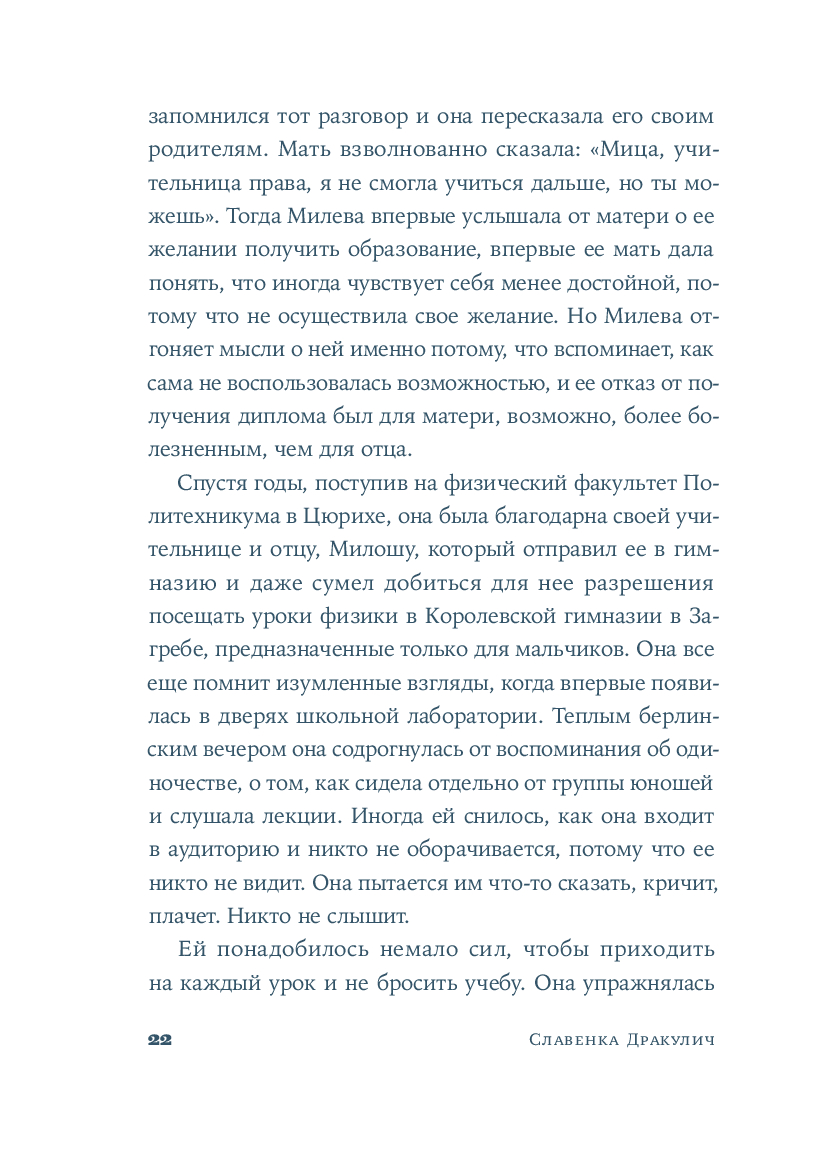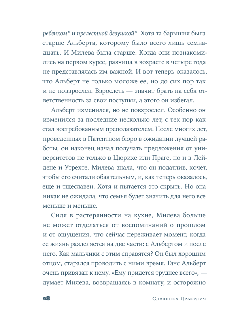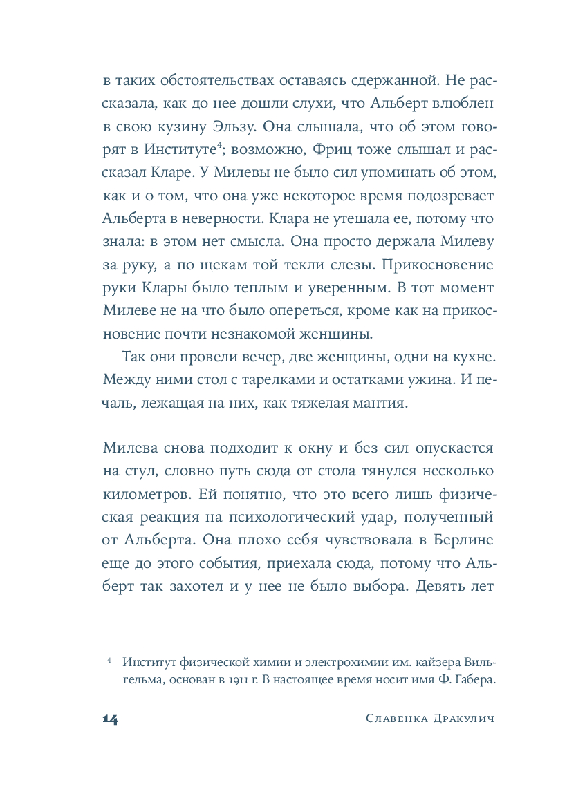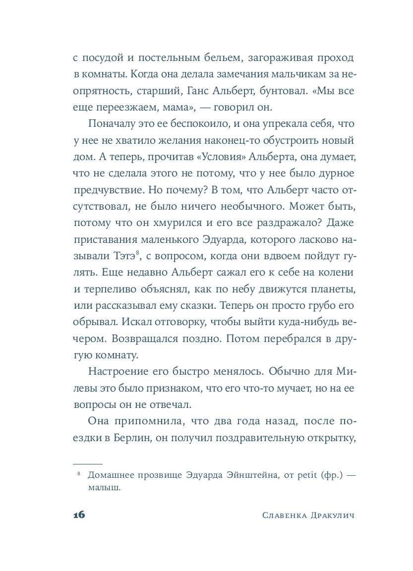 Хорватская писательница и журналистка Славенка Дракулич рассказывает о женщине, которой история присудила остаться в тени знаменитого мужчины. Основанный на фактах и подлинных письмах, роман проливает свет на личность и жизнь человека, изменившего представления о пространстве и времени. Но в первую очередь автор дает слово той, которая любила, поддерживала, терпела и боролась – и так легко была предана забвению.