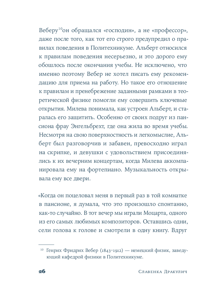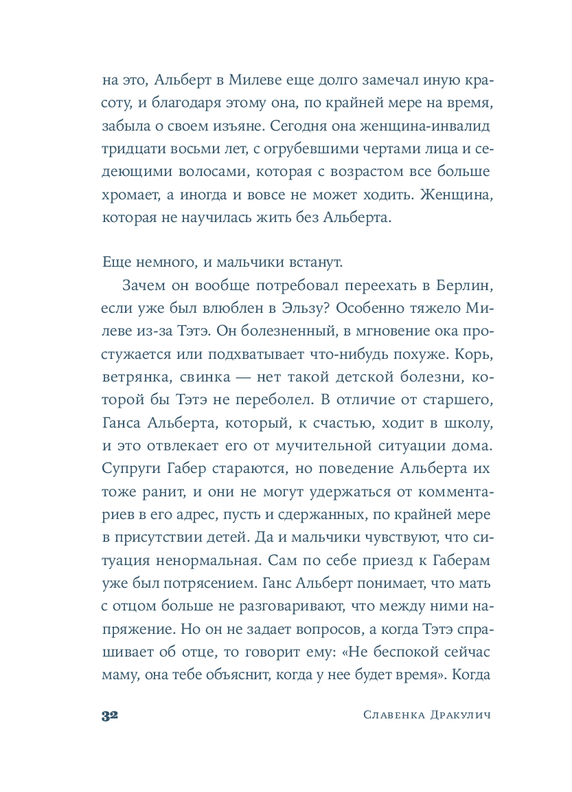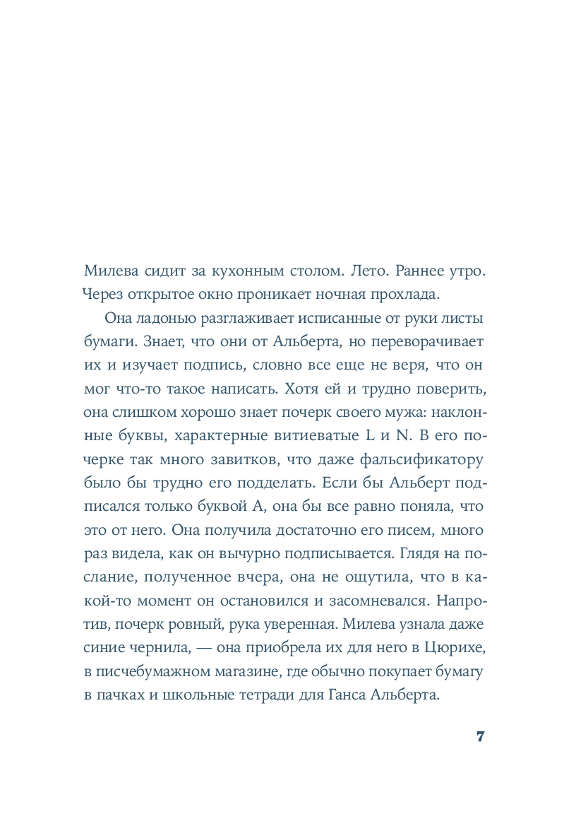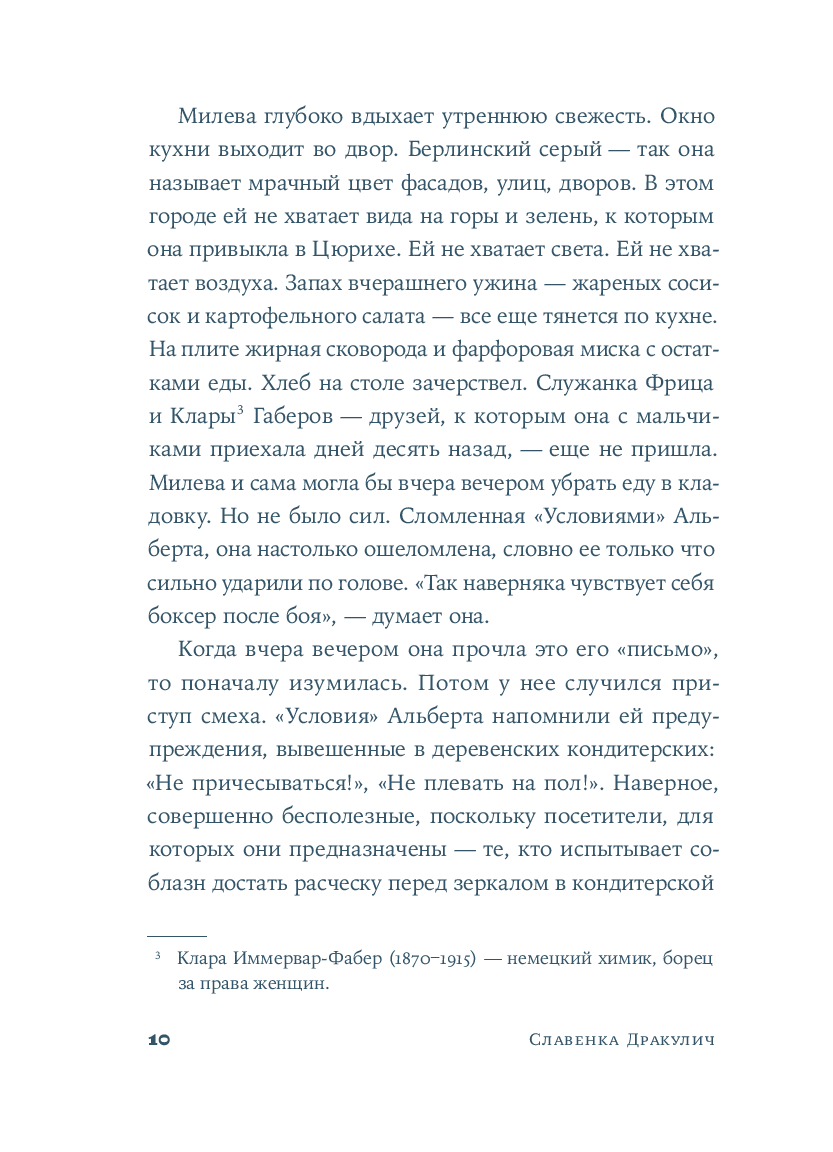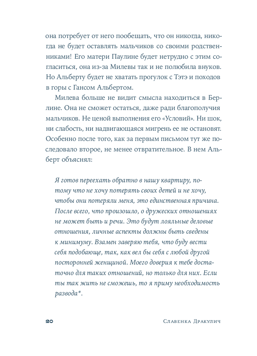Хорватская писательница и журналистка Славенка Дракулич рассказывает о женщине, которой история присудила остаться в тени знаменитого мужчины. Основанный на фактах и подлинных письмах, роман проливает свет на личность и жизнь человека, изменившего представления о пространстве и времени. Но в первую очередь автор дает слово той, которая любила, поддерживала, терпела и боролась – и так легко была предана забвению.