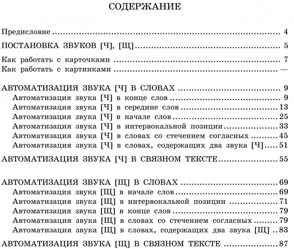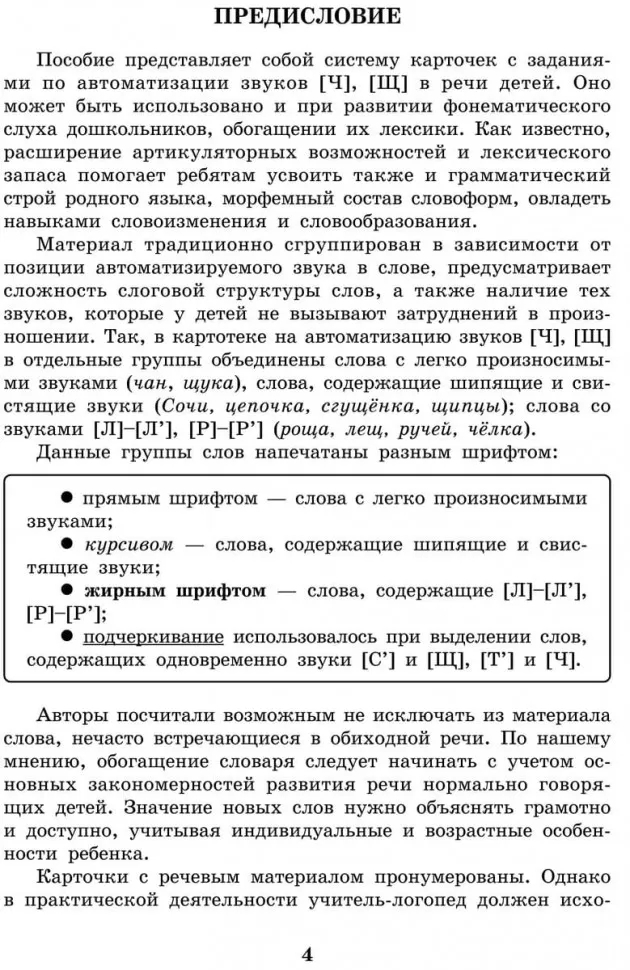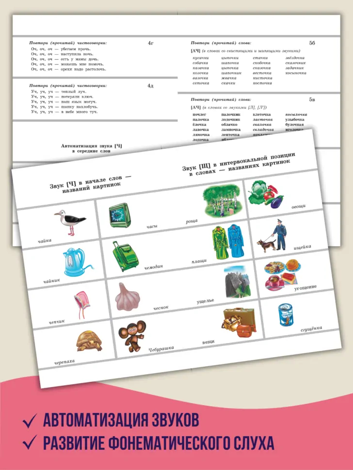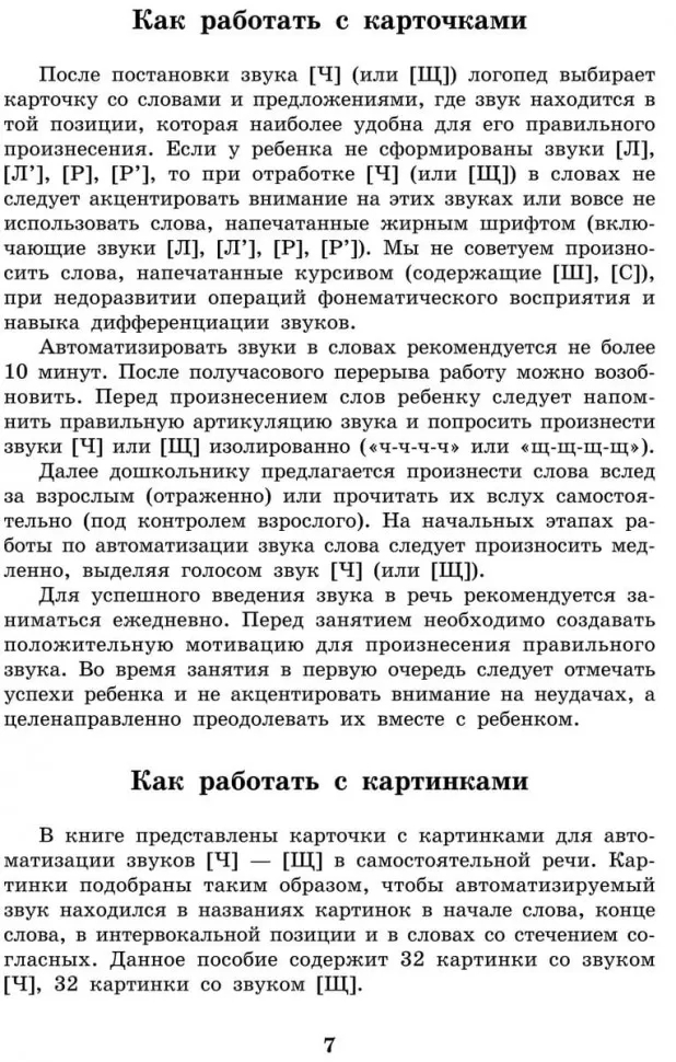 В книге имеются карточки с цветными картинками, которые можно использовать для автоматизации звуков [Ч], [Щ] в самостоятельной речи. Звуки [Ч], [Щ] в названиях картинок находятся в следующих позициях: в начале слова, в его конце, в интервокальной позиции, в словах со стечением согласных.