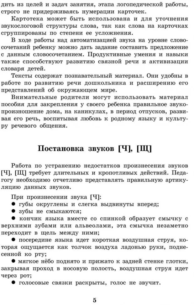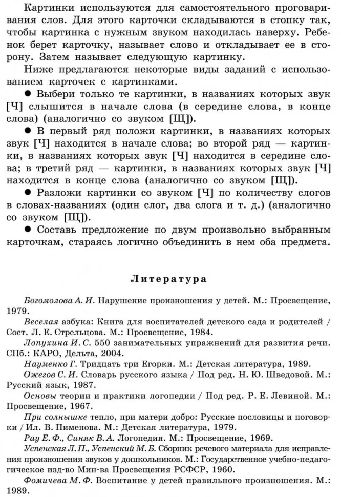 Пособие представляет собой систему карточек с заданиями для автоматизации звуков [Ч], [Щ] в речи детей. Оно может быть использовано для развития фонематического слуха дошкольников и для обогащения их словарного запаса. Как известно, расширение артикуляторных возможностей и лексического запаса помогает ребятам усвоить также и грамматический строй родного языка, морфемный состав словоформ, овладеть навыками словоизменения и словообразования.