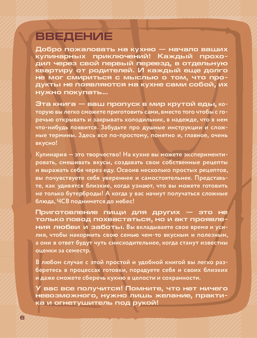 Это книга для тех, кто только переехал в общагу, снял первую квартиру или решил, что теперь будет готовить сам, а сэкономленные деньги отложит себе на новые наушники. Здесь собраны простые и реально вкусные рецепты, которые можно повторить даже на мини-кухне с одной плиткой и чайником.