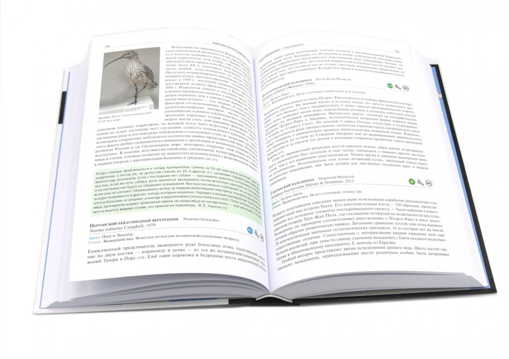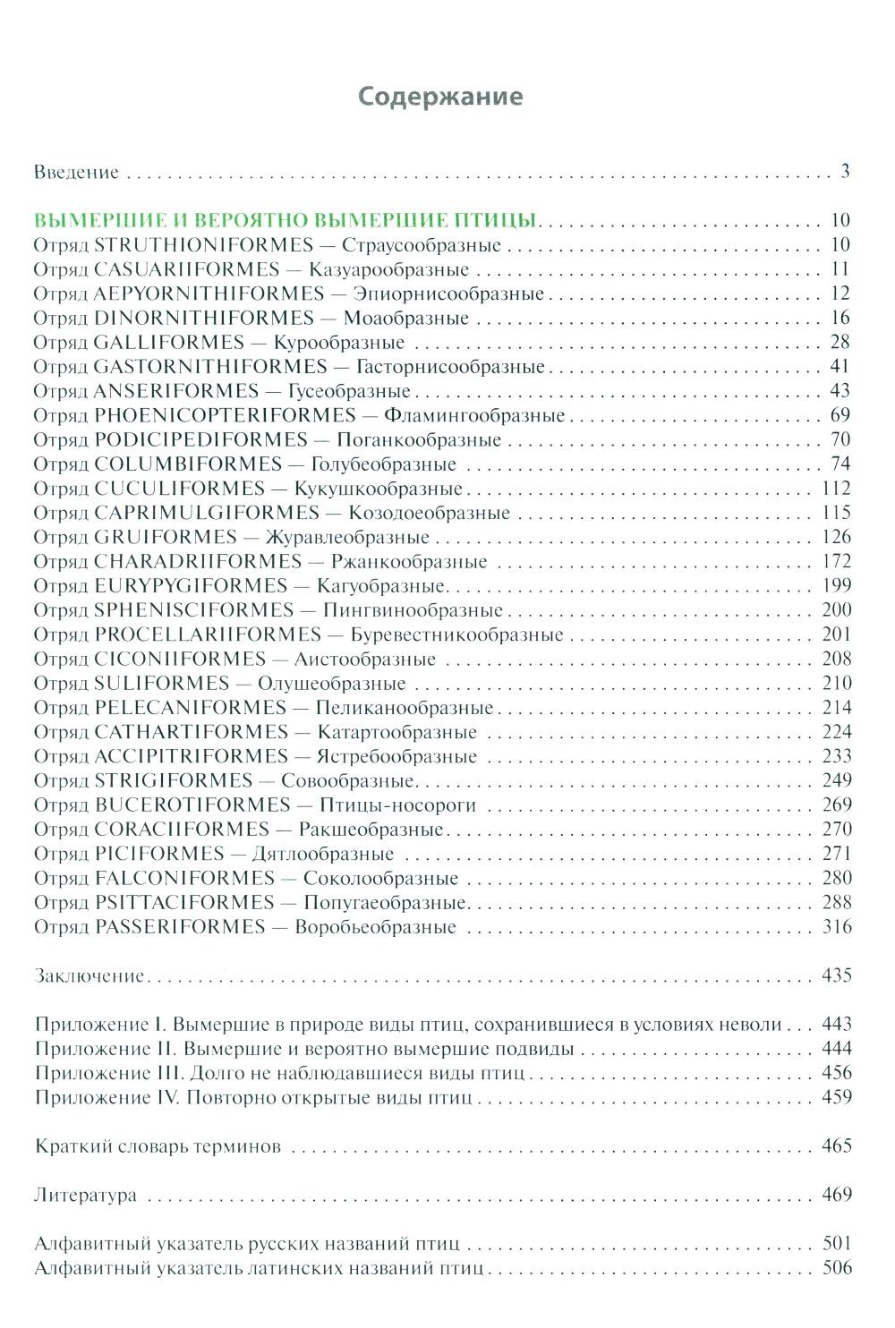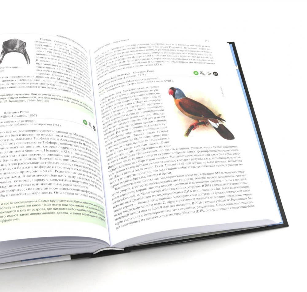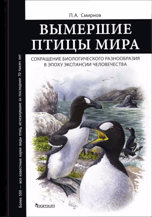 Первый полный научно-популярный справочник на русском языке, посвящённый вымершим и вероятно вымершим позднечетвертичным птицам мира. Для каждого из 525 вошедших в книгу видов приводятся ареалы; фактические доказательства существования, в том числе, при наличии, фотографии чучел, тушек и костных остатков; время и причины предполагаемого вымирания.