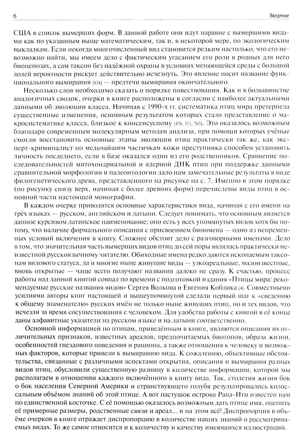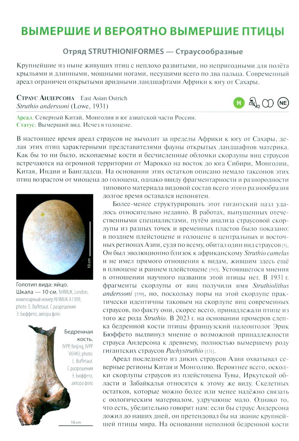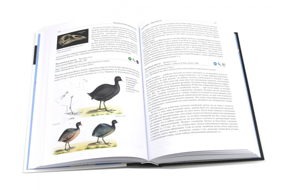 Первый полный научно-популярный справочник на русском языке, посвящённый вымершим и вероятно вымершим позднечетвертичным птицам мира. Для каждого из 525 вошедших в книгу видов приводятся ареалы; фактические доказательства существования, в том числе, при наличии, фотографии чучел, тушек и костных остатков; время и причины предполагаемого вымирания.