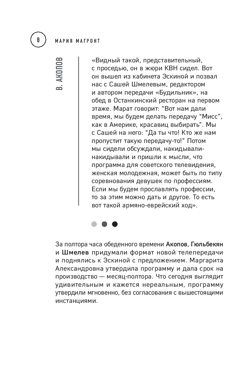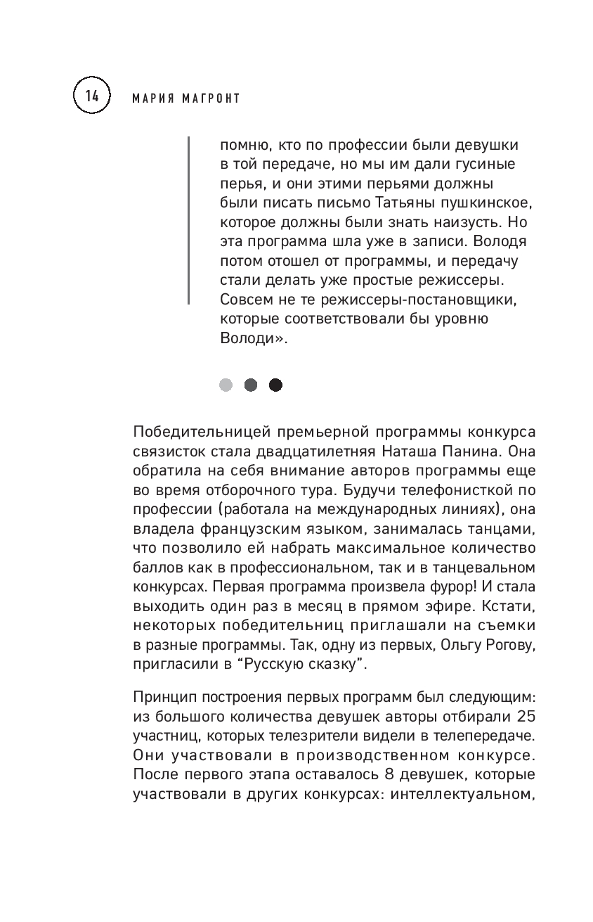В этой книге создатели отечественного телевидения – Владимир Акопов, Наталия Стеценко, Кира Прошутинская, Борис Крюк и другие рассказывают истории появления программ, поиск и эксперименты на телевизионных площадках, яркие взлеты и громкие выговоры и многое другое.
