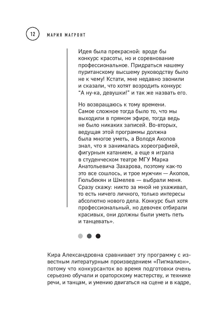 Эта книга о программах, во время эфира которых улицы "вымирали", о пионерах-создателях этих знаковых телевизионных передач: "А ну-ка, девушки!", "От всей души", "Клуб путешественников", "Что? Где? Когда?", "Любовь с первого взгляда", "Пресс-клуб", "Будка гласности", "Акуна матата", "Времечко", "Счастливый случай", "Намедни", "Взгляд", "Дежурный по стране" и другие.