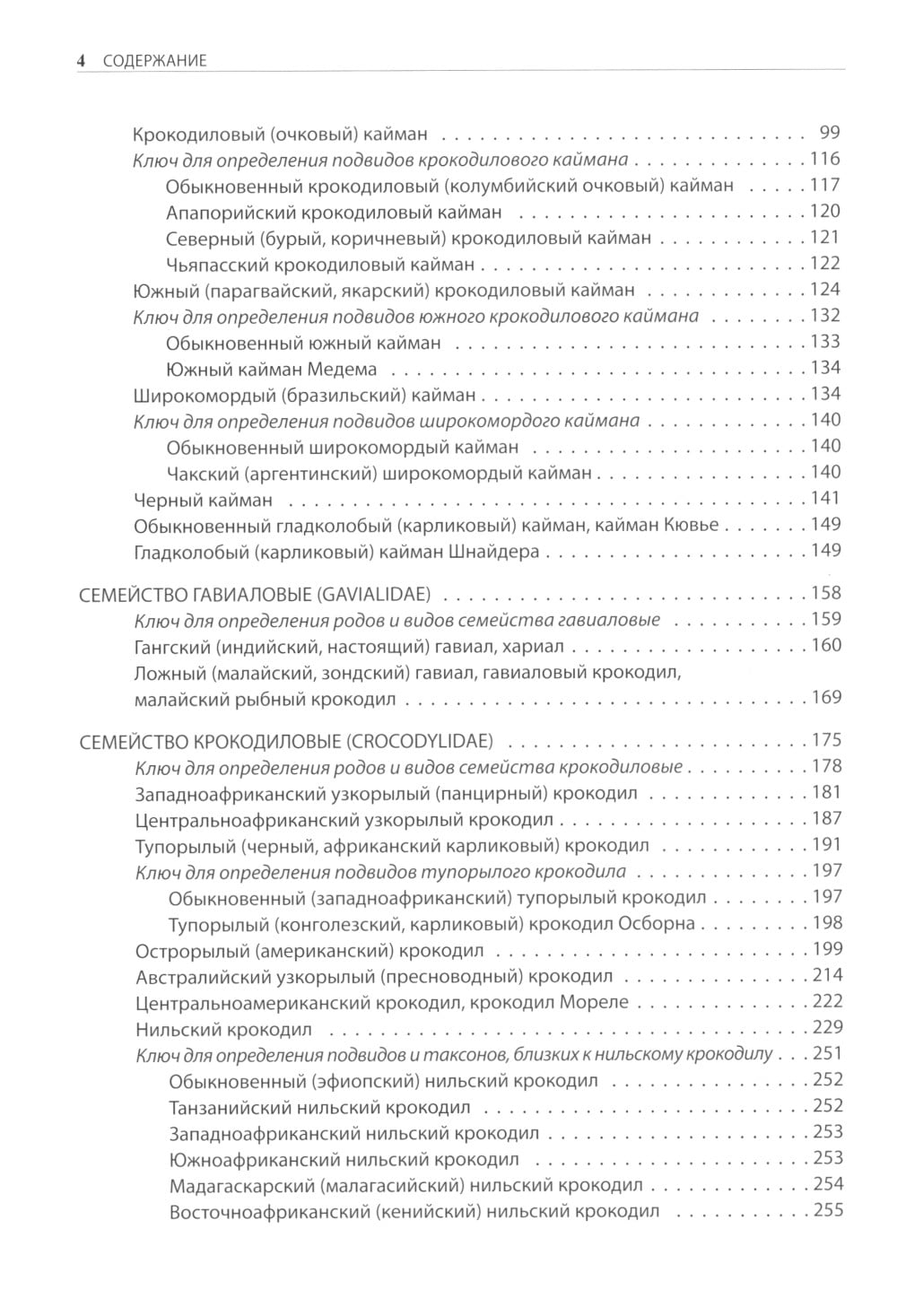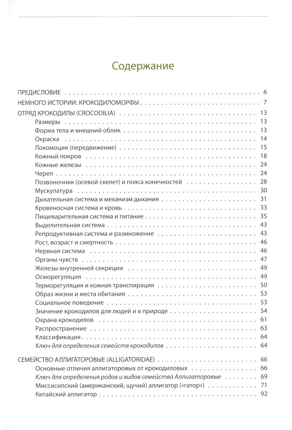 Подробнейшим образом описаны внешность, распространение, места обитания, особенности размножения, гнездования и развития каждого вида. Приводятся сведения об охранном статусе крокодилов, их содержании в неволе и о проблемах, связанных с торговлей и разведением. Особое место в книге отведено роли крокодилов в экосистемах и значении этих животных для человека.