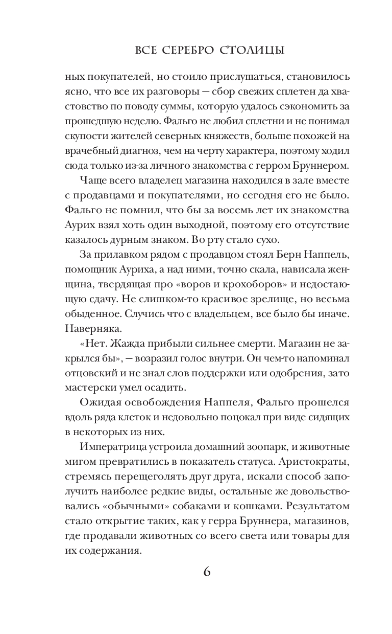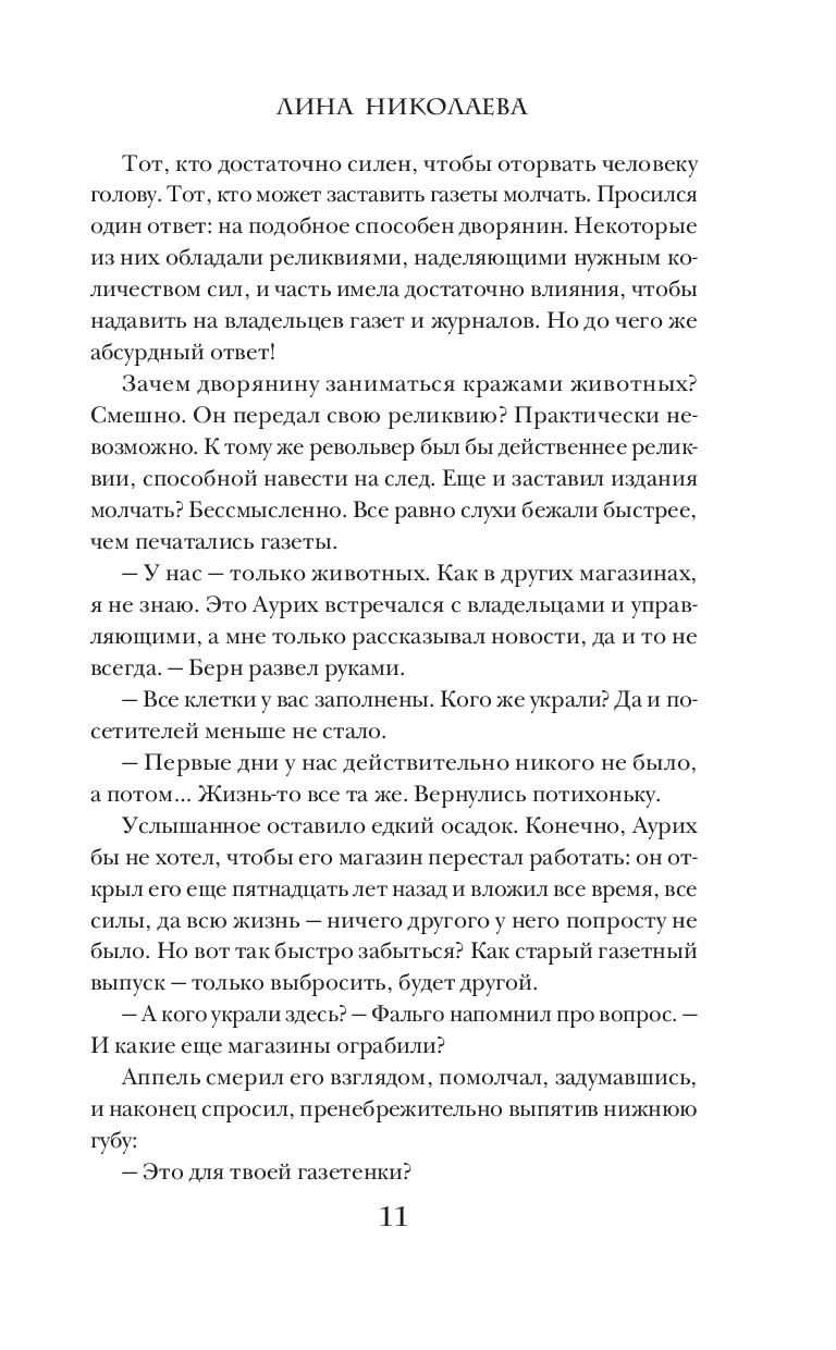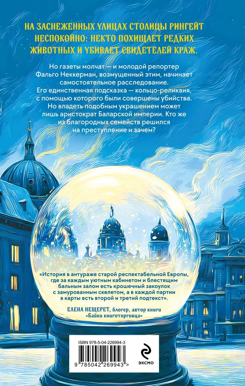 На заснеженных улицах столицы Рингейт неспокойно: некто похищает редких животных и убивает свидетелей краж. Но газеты молчат – и молодой репортер Фальго Неккерман, возмущенный этим, начинает самостоятельное расследование. Его единственная подсказка – кольцо-реликвия, с помощью которого были совершены убийства. Но владеть подобным украшением может лишь аристократ Баларской империи. Кто же из благородных семейств решился на преступление и зачем?