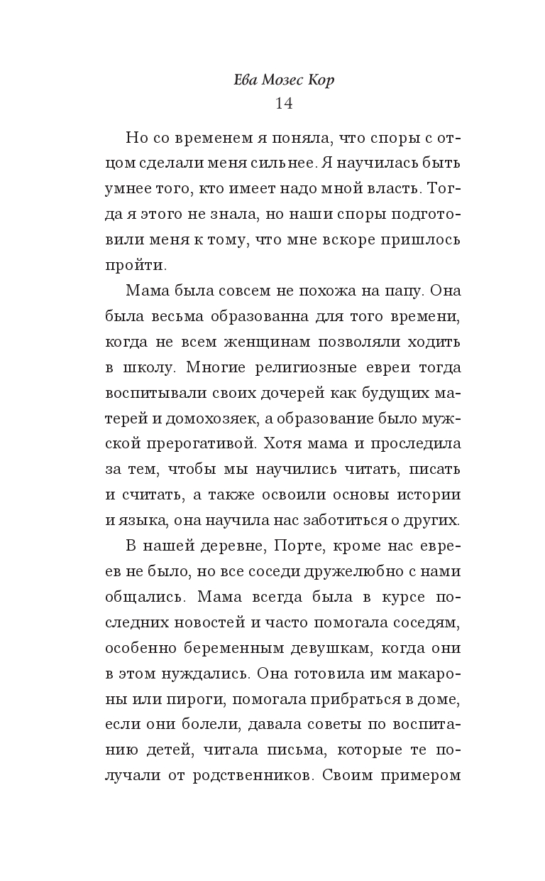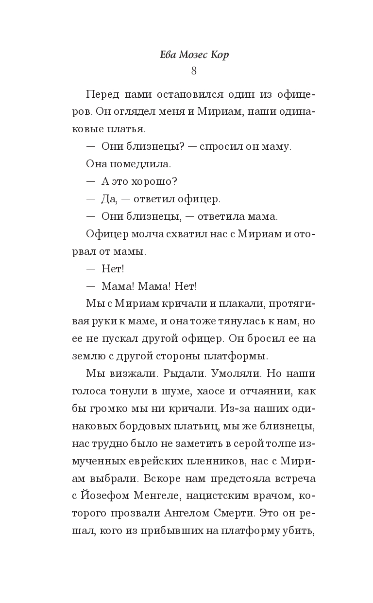 Летом 1944 г. Ева Мозес Кор и ее семья прибыли в Освенцим. Ее родители и две старших сестры были отправлены в газовые камеры, а Ева и ее близнец Мириам — переданы в руки человеку, который стал известен как Ангел Смерти, – доктору Йозефу Менгеле. Им было по 10 лет.