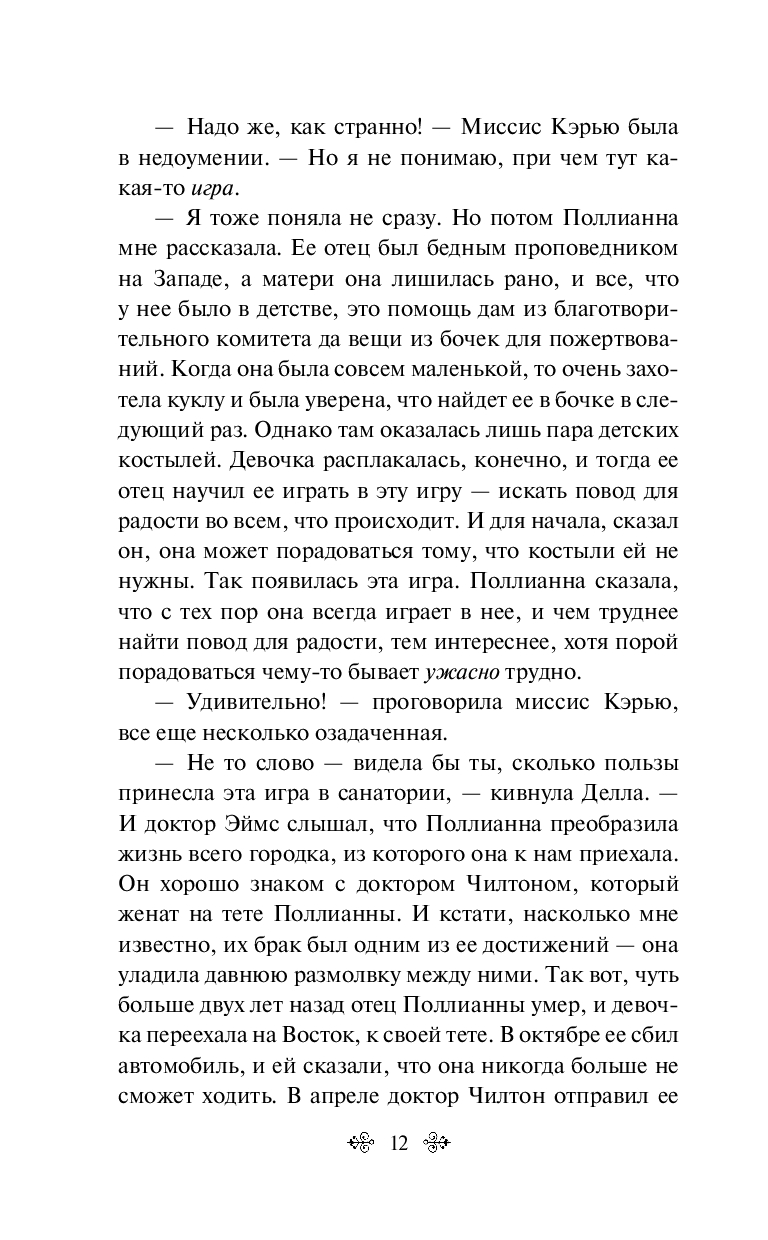 "Для радости всегда есть повод, надо только его найти", – так рассуждает Поллианна, главная героиня светлой и доброй повести Элинор Портер. Поллианна – круглая сирота, но она не отчаивается. Ее суперспособность – во всем видеть хорошее и радоваться всему, что с ней происходит. Ее радует и чердак, куда ее поселила тетушка Полли, приютившая сиротку. Поллианна находит радость в самых грустных вещах, но однажды с ней случается несчастье: вероятно, она никогда больше не сможет ходить. Но даже это страшное несчастье оборачивается радостными событиями благодаря оптимизму сиротки.