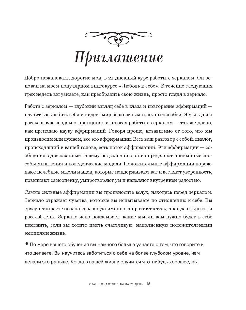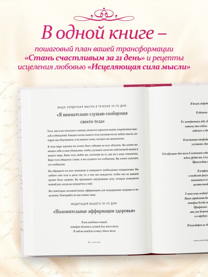 В этой книге собраны под одной обложкой два мировых бестселлера Луизы Хей:"Стань счастливым за 21 день" и "Исцеляющая сила мысли". Осознавайте каждый свой шаг, действие и чувство, любите себя такими, какие вы есть, принимайте с благодарностью все, чем щедро делится с вами жизнь, дарите свою любовь окружающим и Вселенной, черпайте вдохновение в позитивных мыслях и утверждениях – знаменитых аффирмациях Луизы, и скоро вы испытаете на себе их силу!