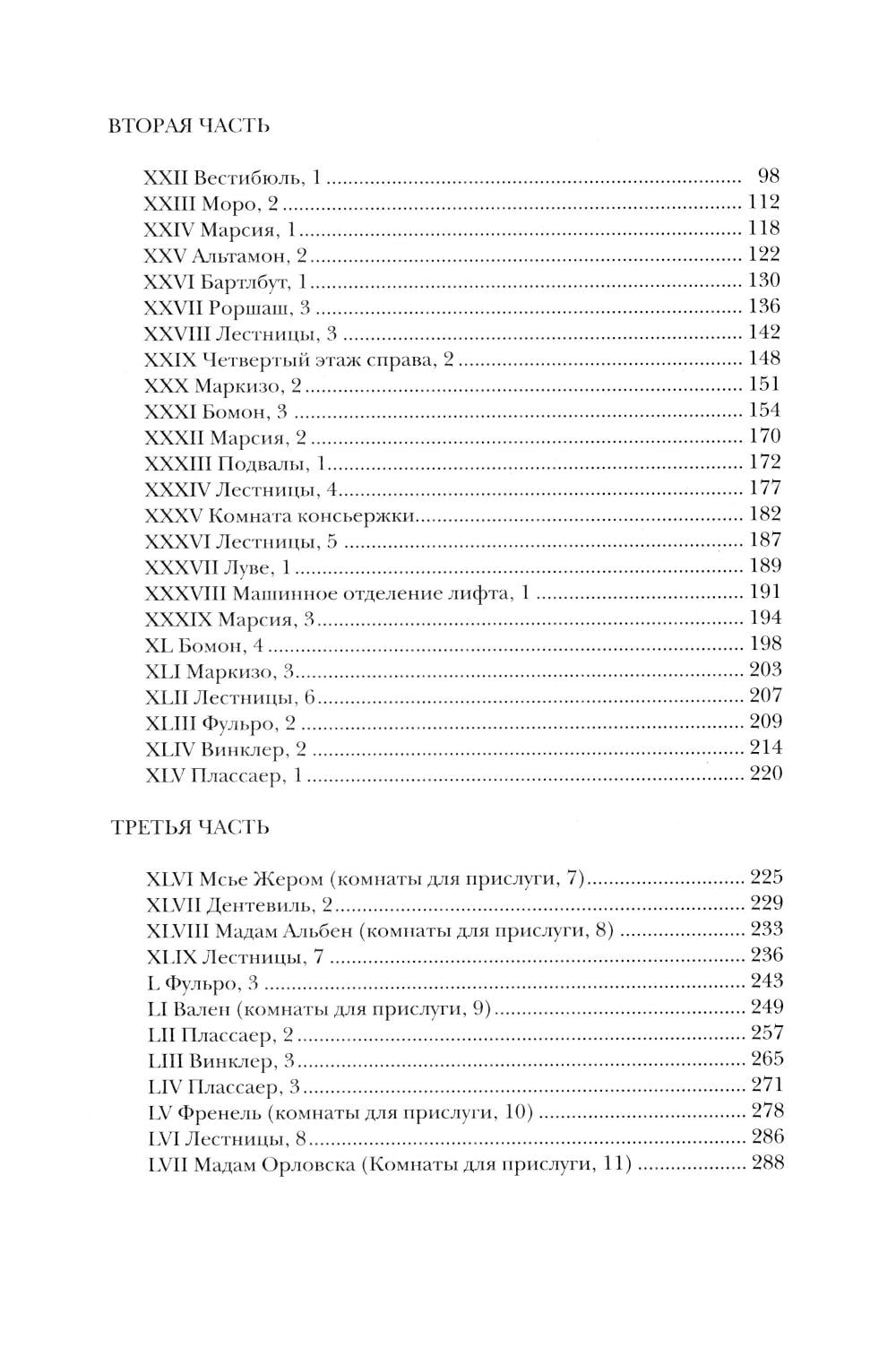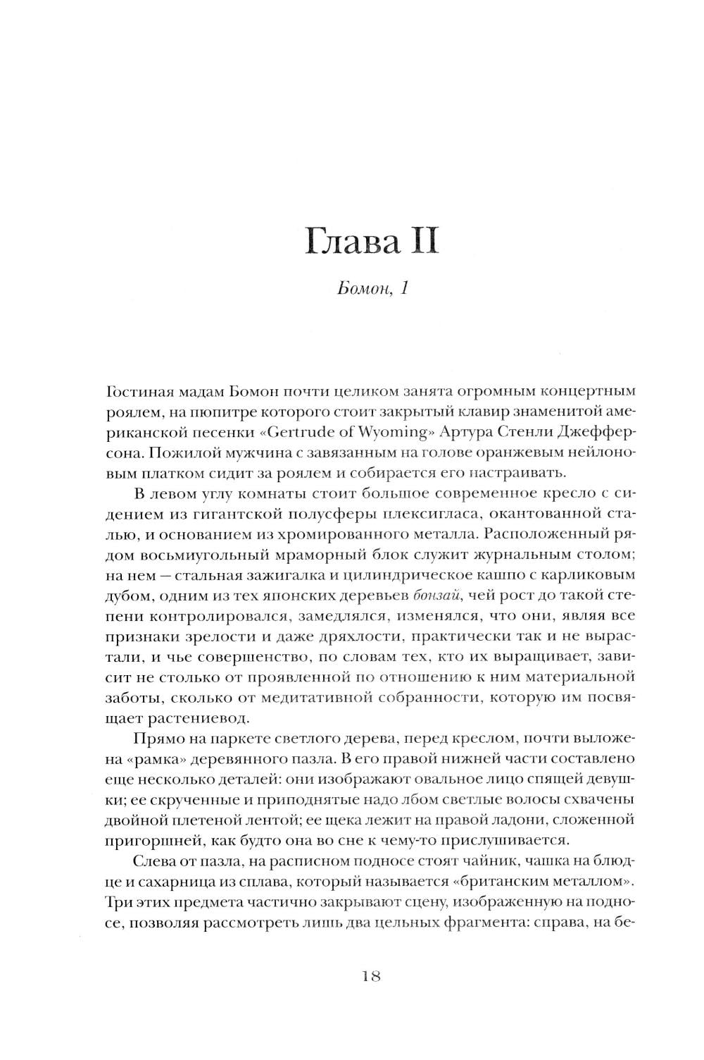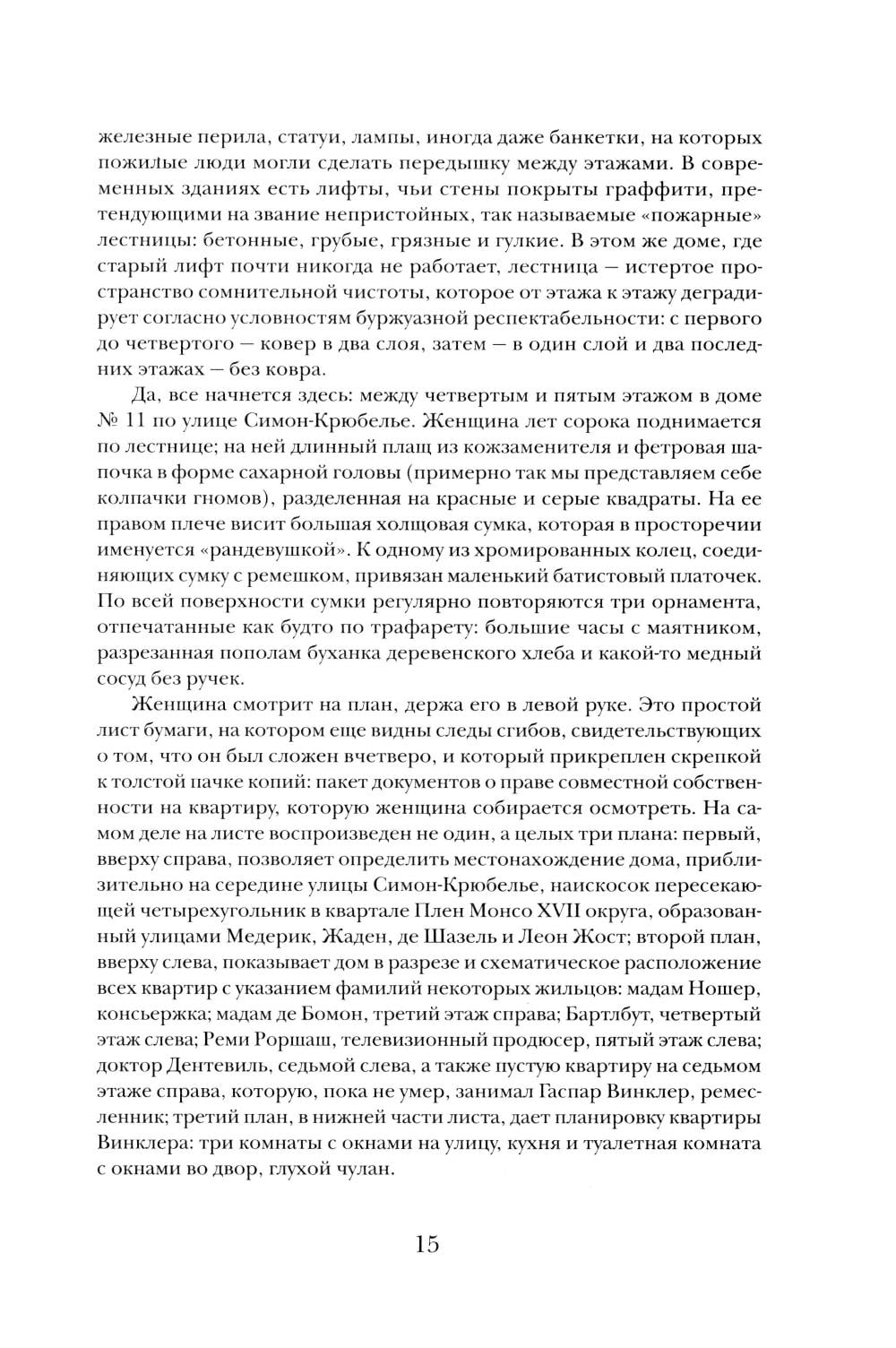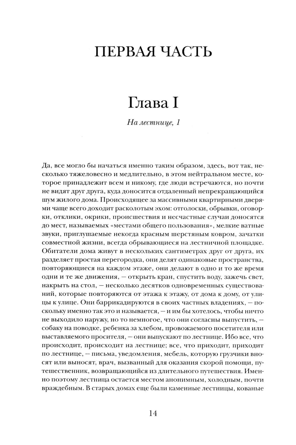 Роман – полное и методичное описание парижского дома с населяющими его предметами и людьми – состоит из искусно выстроенной последовательности локальных романов, целой череды смешных и грустных, заурядных и экстравагантных историй, в которых причудливо переплетаются судьбы и переживаются экзотические приключения, мелкие происшествия, чудовищные преступления, курьезные случаи, детективные расследования, любовные драмы, комические совпадения, загадочные перевоплощения, роковые заблуждения, а еще маниакальные идеи и утопические прожекты.