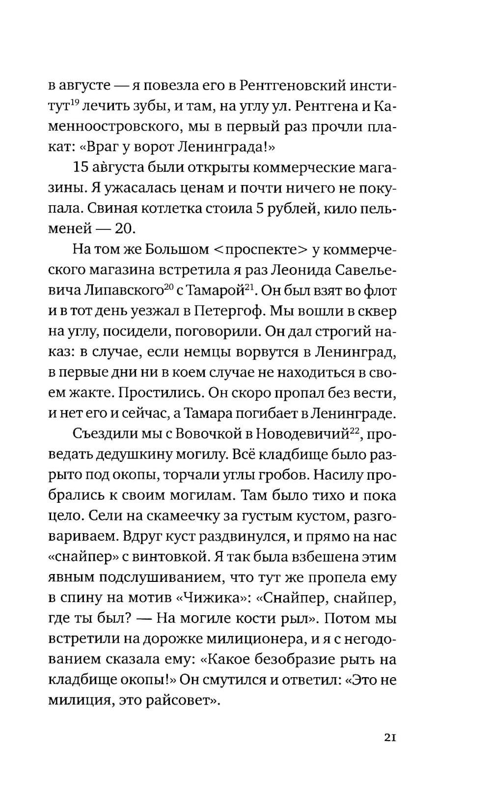 "…И муж и я – мы оба убитые люди. Я знаю, что взялась за непосильную задачу. Блокада ждет своего певца – масштабов Достоевского и Блока. Я только описала нашу общую долю бедствий и те картины и встречи, которые попались на моем пути" (цитата из книги).