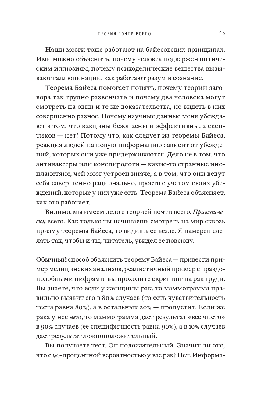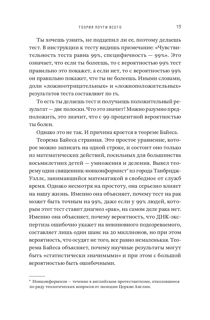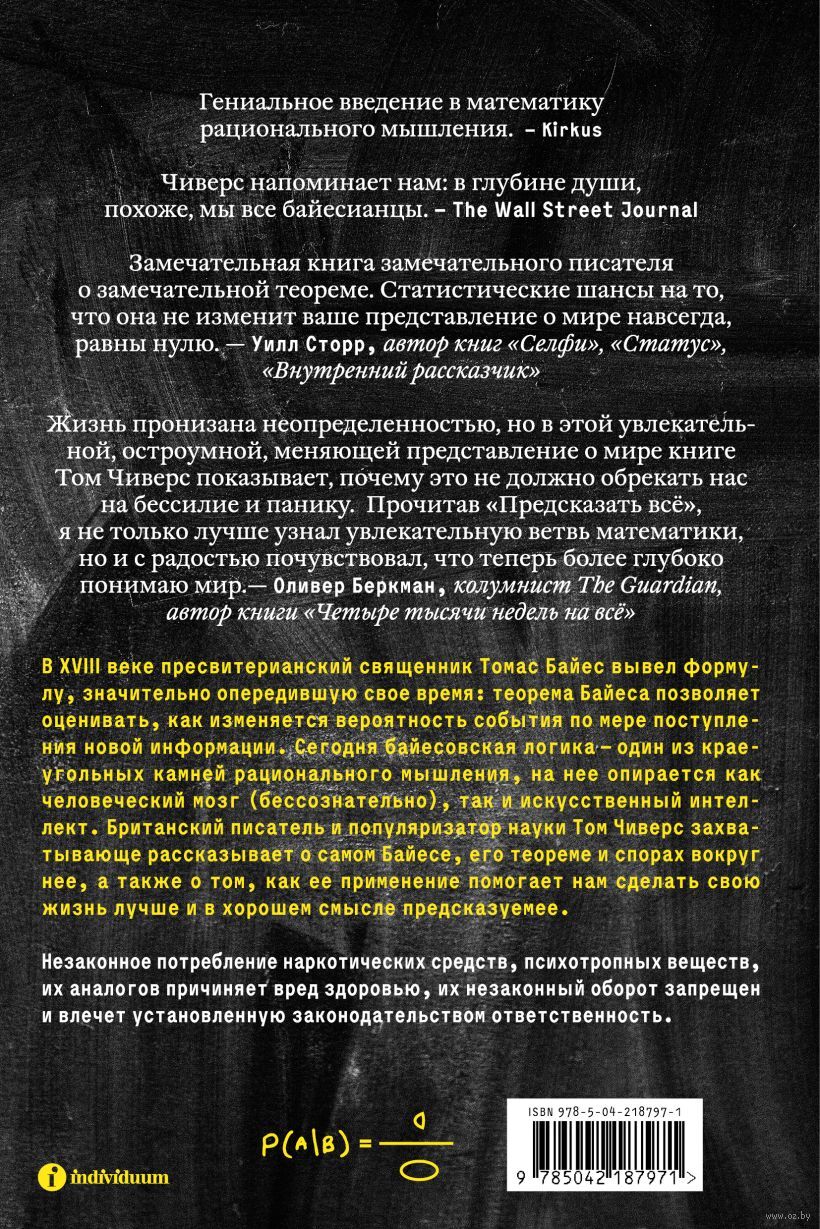 В XVIII веке пресвитерианский священник Томас Байес вывел формулу, значительно опередившую свое время: теорема Байеса позволяет оценивать, как изменяется вероятность события по мере поступления новой информации. Сегодня байесовская логика – один из краеугольных камней рационального мышления, на нее опирается как человеческий мозг (бессознательно), так и искусственный интеллект. Британский писатель и популяризатор науки Том Чиверс захватывающе рассказывает о самом Байесе, его теореме и спорах вокруг нее, а также о том, как ее применение помогает нам сделать свою жизнь лучше и в хорошем смысле предсказуемее.