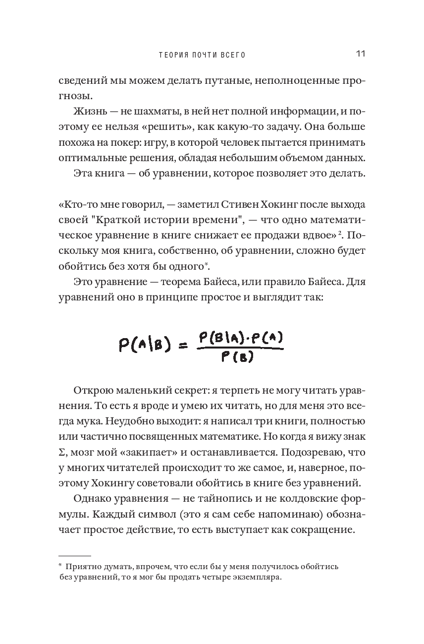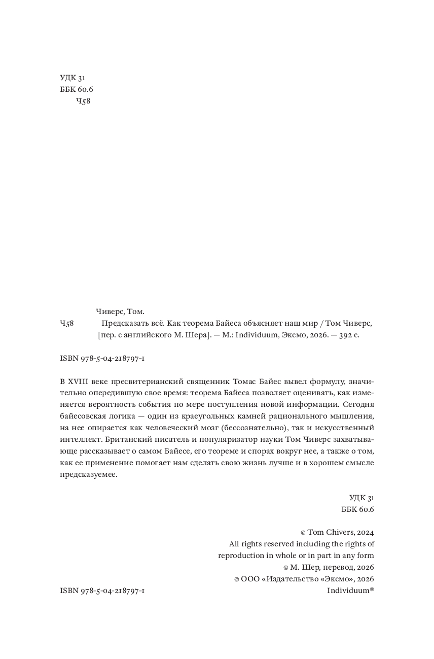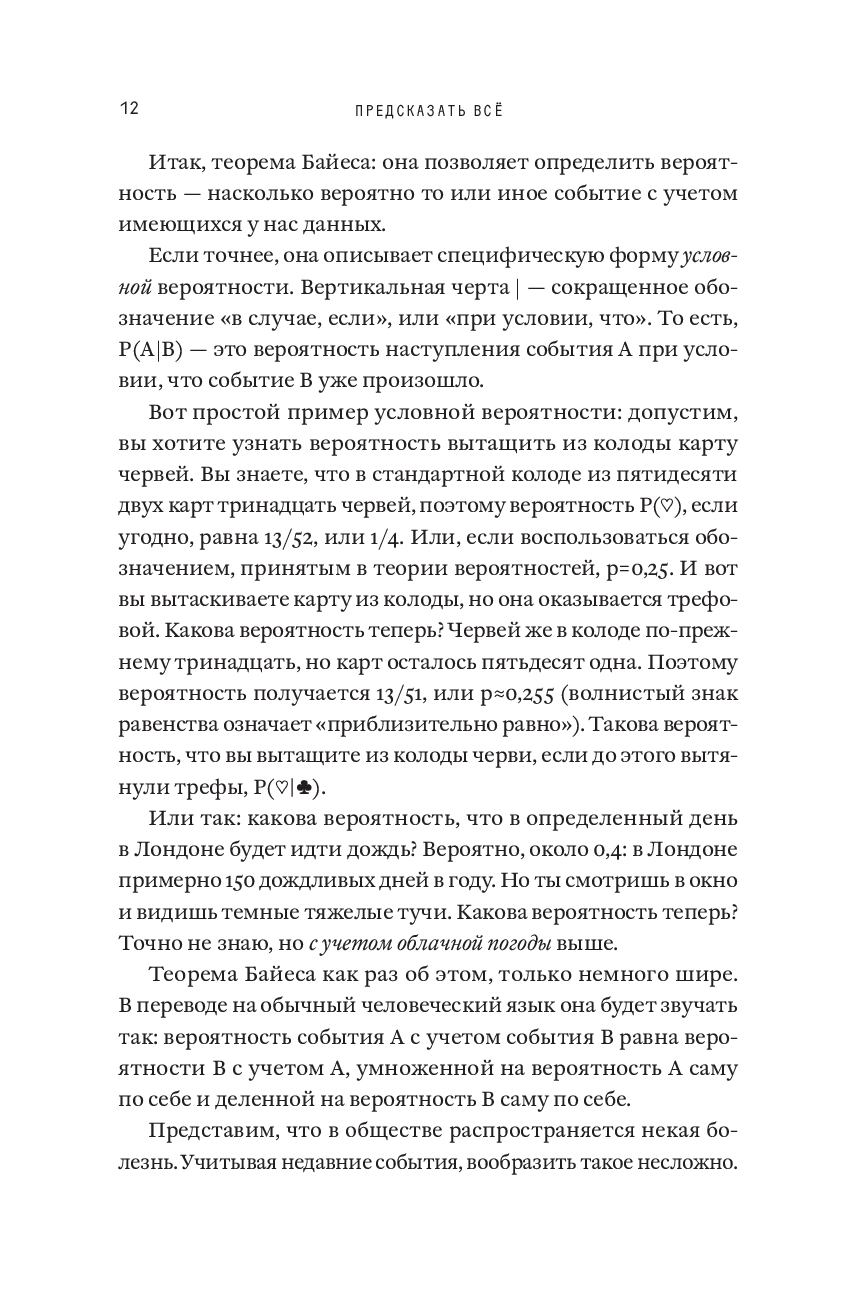 В XVIII веке пресвитерианский священник Томас Байес вывел формулу, значительно опередившую свое время: теорема Байеса позволяет оценивать, как изменяется вероятность события по мере поступления новой информации. Сегодня байесовская логика – один из краеугольных камней рационального мышления, на нее опирается как человеческий мозг (бессознательно), так и искусственный интеллект. Британский писатель и популяризатор науки Том Чиверс захватывающе рассказывает о самом Байесе, его теореме и спорах вокруг нее, а также о том, как ее применение помогает нам сделать свою жизнь лучше и в хорошем смысле предсказуемее.