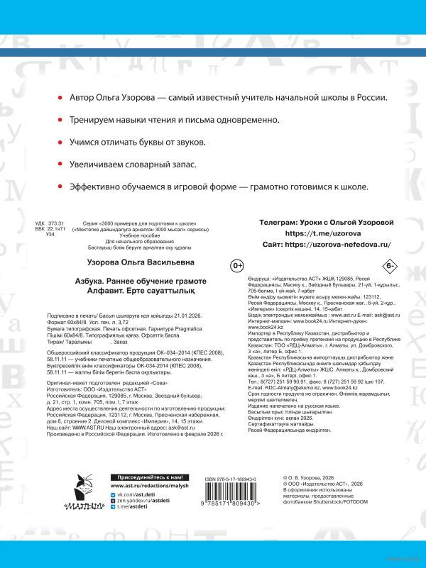 "Азбука. Раннее обучение грамоте" – это незаменимый помощник для родителей, которые хотят, чтобы их дети быстро научились читать и писать. Благодаря уникальной авторской методике О. В. Узоровой ребята без труда выучат буквы от А до Я, потренируются их писать, научатся отличить буквы от звуков, пополнят словарный запас.