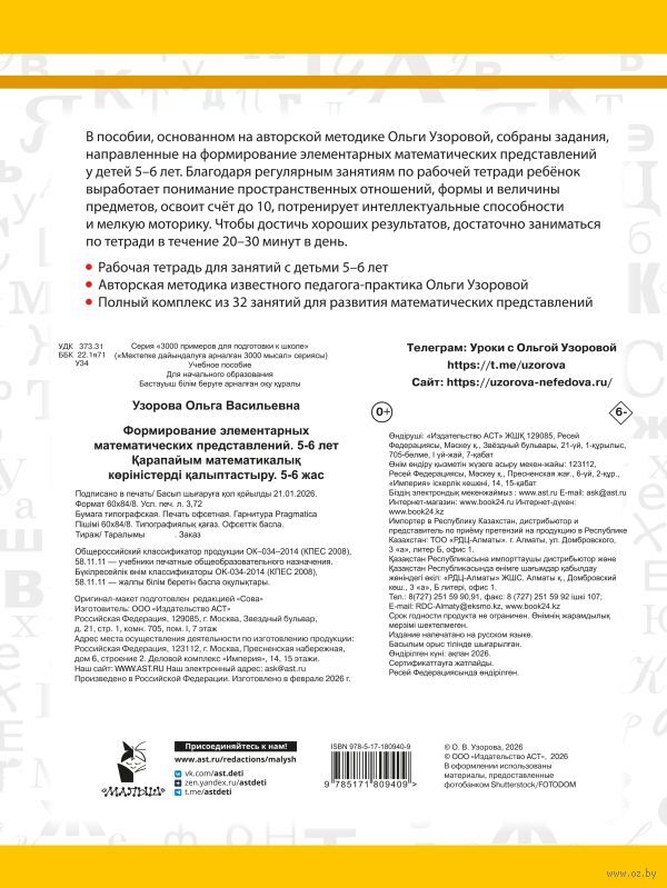 "Формирование элементарных математических представлений. 5–6 лет" – это комплекс занятий по математике, основанный на эффективной авторской методике О. В. Узоровой. Рабочая тетрадь включает 32 занятия и содержит разнообразные упражнений, направленные на формирование у дошкольников первичных математических представлений. Благодаря регулярным занятиям, дети разовьют мышление, потренируют мелкую моторику, подготовят руку к письму, а также получат все необходимые знания и навыки для учёбы в школе.