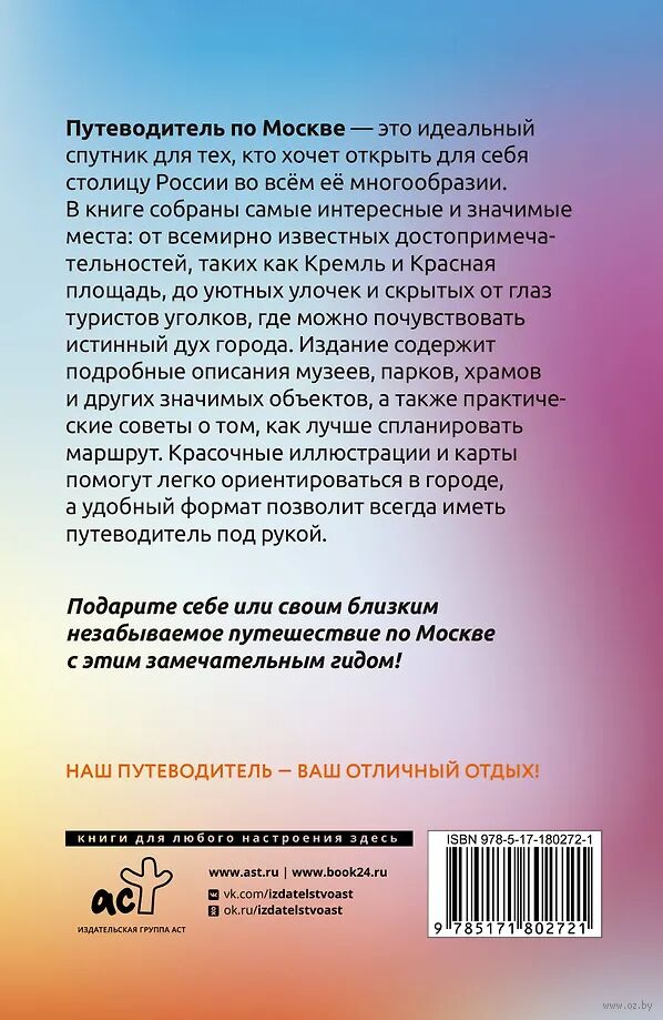 Путеводитель по Москве – это идеальный спутник для тех, кто хочет открыть для себя столицу России во всём её многообразии. В книге собраны самые интересные и значимые места: от всемирно известных достопримечательностей, таких как Кремль и Красная площадь, до уютных улочек и скрытых от глаз туристов уголков, где можно почувствовать истинный дух города. Издание содержит подробные описания музеев, парков, храмов и других значимых объектов, а также практические советы о том, как лучше спланировать маршрут. Красочные иллюстрации и карты помогут легко ориентироваться в городе, а удобный формат позволит всегда иметь путеводитель под рукой. Подарите себе или своим близким незабываемое путешествие по Москве с этим замечательным гидом!