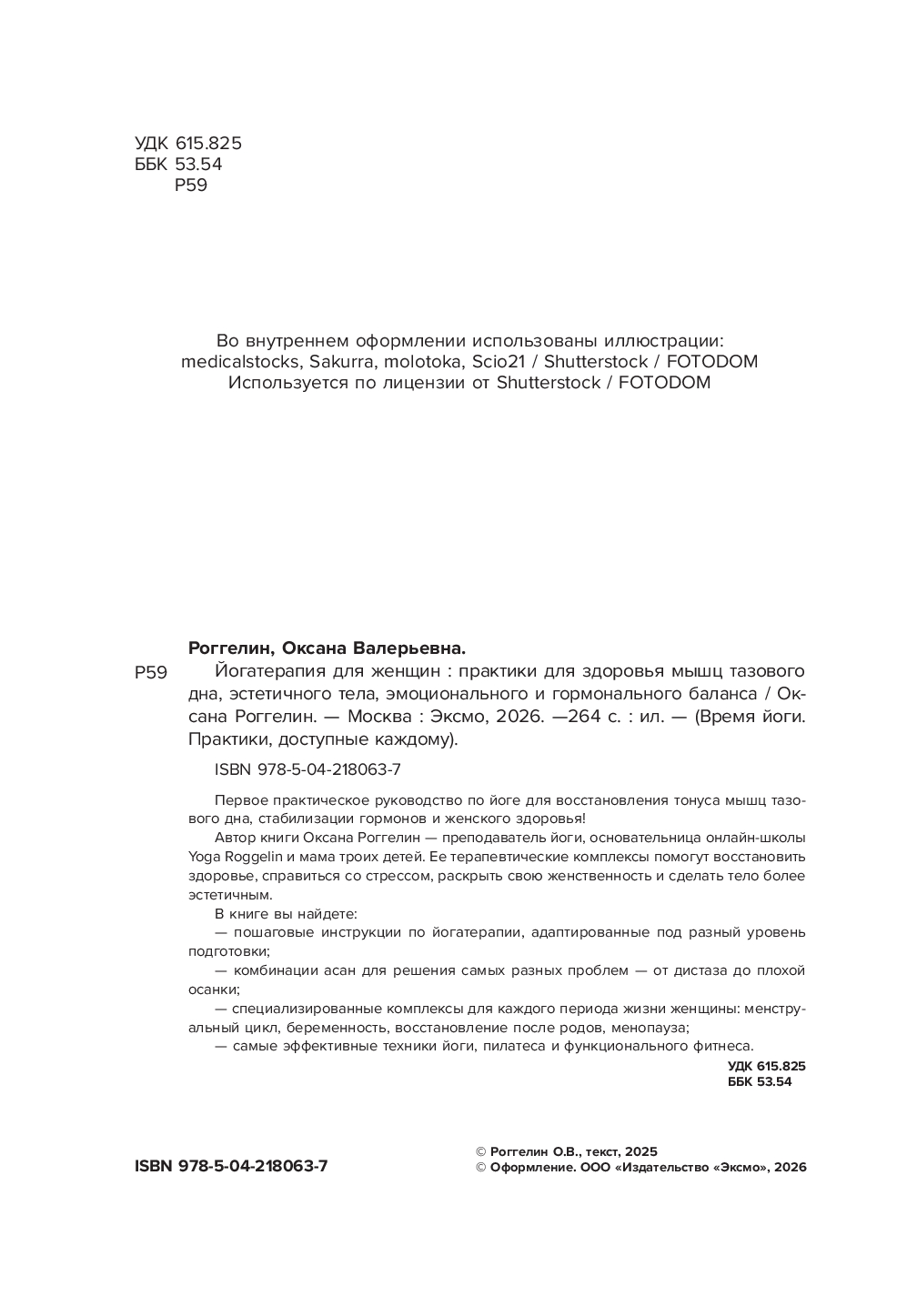 Автор книги Оксана Роггелин – преподаватель йоги, основательница онлайн-школы Yoga Roggelin и мама троих детей. Ее терапевтические комплексы помогут восстановить здоровье, справиться со стрессом, раскрыть свою женственность и сделать тело более эстетичным.