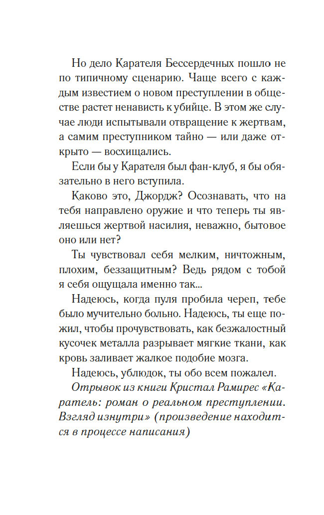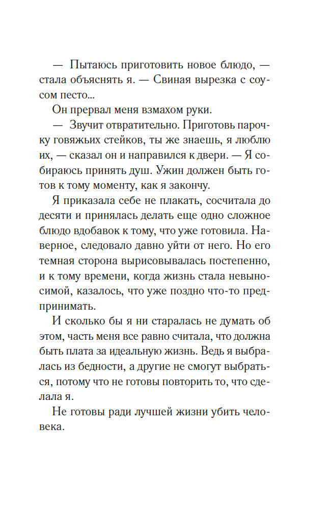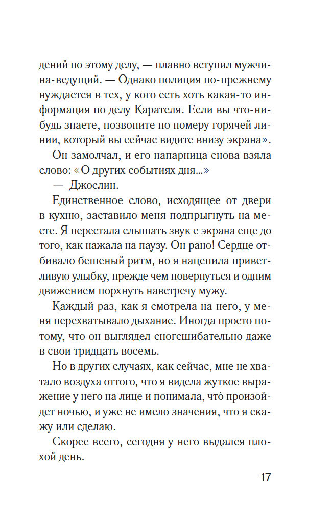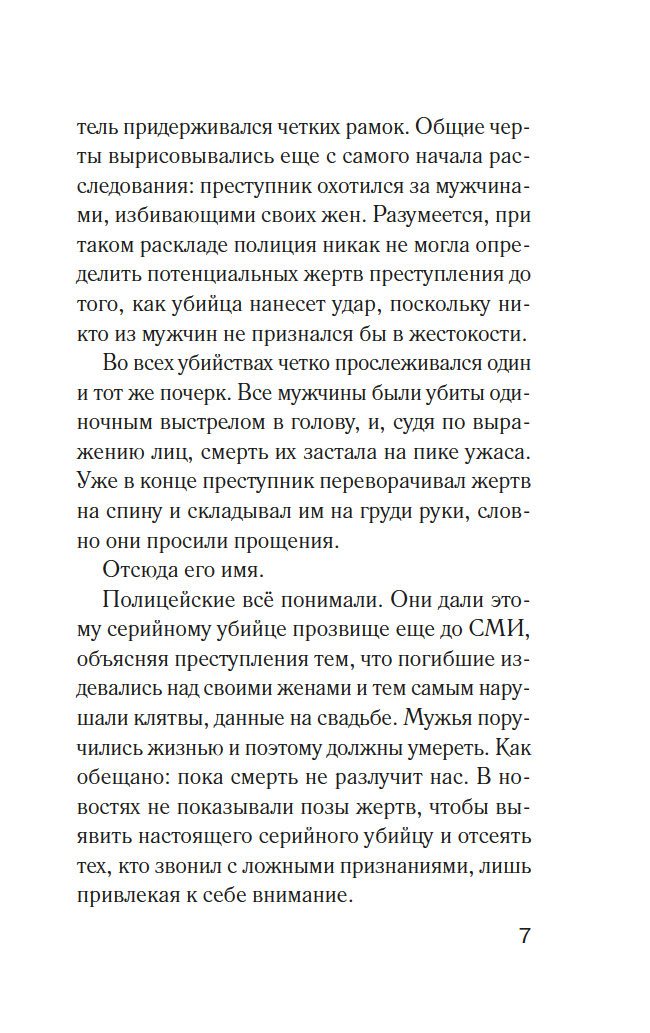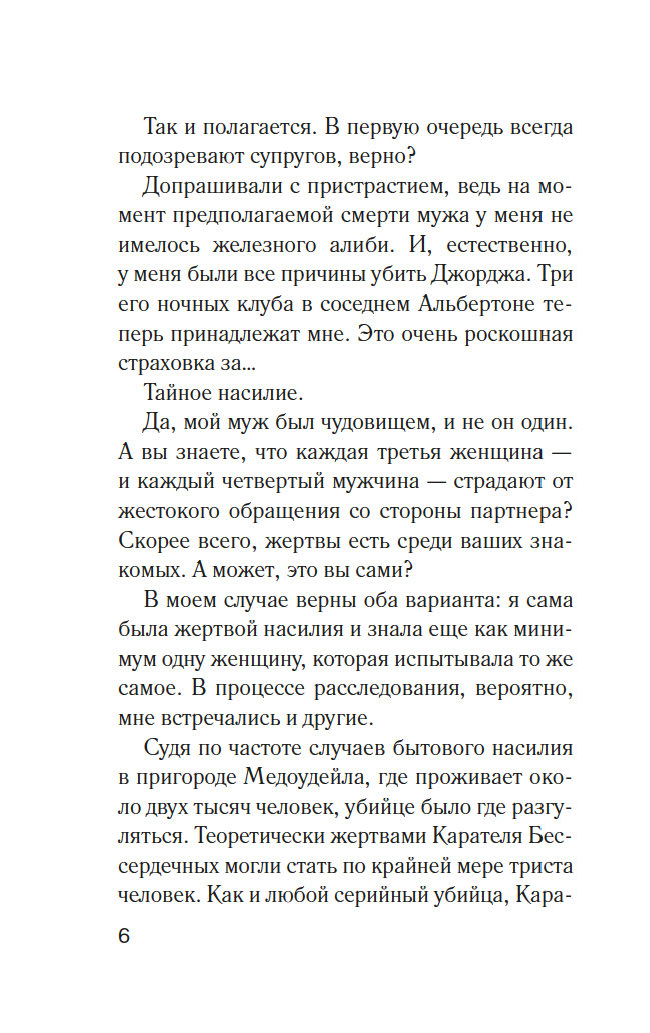 А вы знали, что каждая третья женщина и каждый четвертый мужчина страдают от жестокого обращения со стороны партнера? Эту страшную статистику на собственном опыте приходится проверить нескольким жительницам фешенебельного пригорода Медоудейл. У каждой своя история, но у всех общая беда: мужья-тираны. Защититься от них невозможно, попытки сбежать приводят лишь к новым зверским расправам. Кажется, выхода нет, но внезапно жестоких мужей начинают убивать одного за другим. В полиции загадочного преступника называют Карателем Бессердечных: застрелив жертву, он складывает покойнику руки на груди, словно тот просит прощения. Кто же мстит за несчастных женщин?