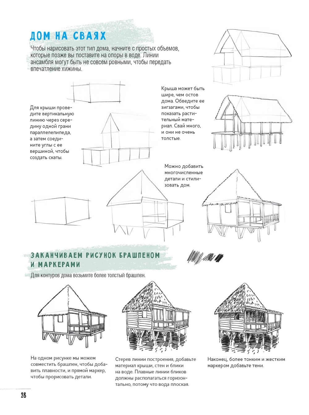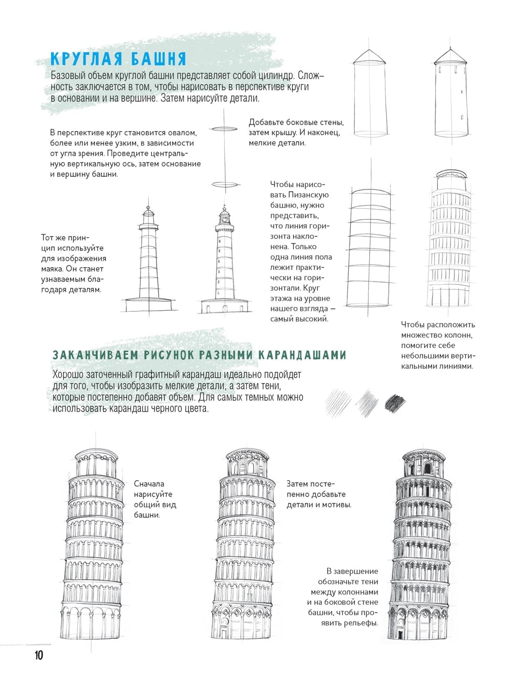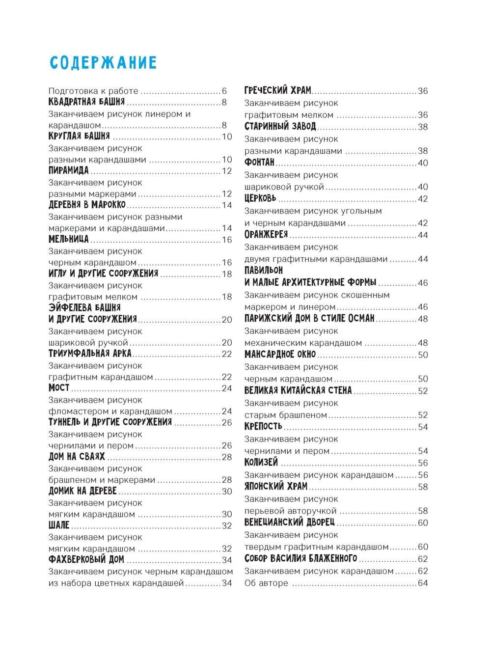 В этом скетчбуке вас ждут мастер-классы по рисованию зданий и построек: домов, дворцов, башен, пирамид, замков и т. д. Для простоты и наглядности автор разбивает каждое строение на простые формы и объемы, а затем с помощью различных приемов светотени и перспективы, а также разнообразных принадлежностей, дополняет деталями базовую структуру, превращая на наших глазах несколько объемных геометрических форм, к примеру, в… собор Василия Блаженного!