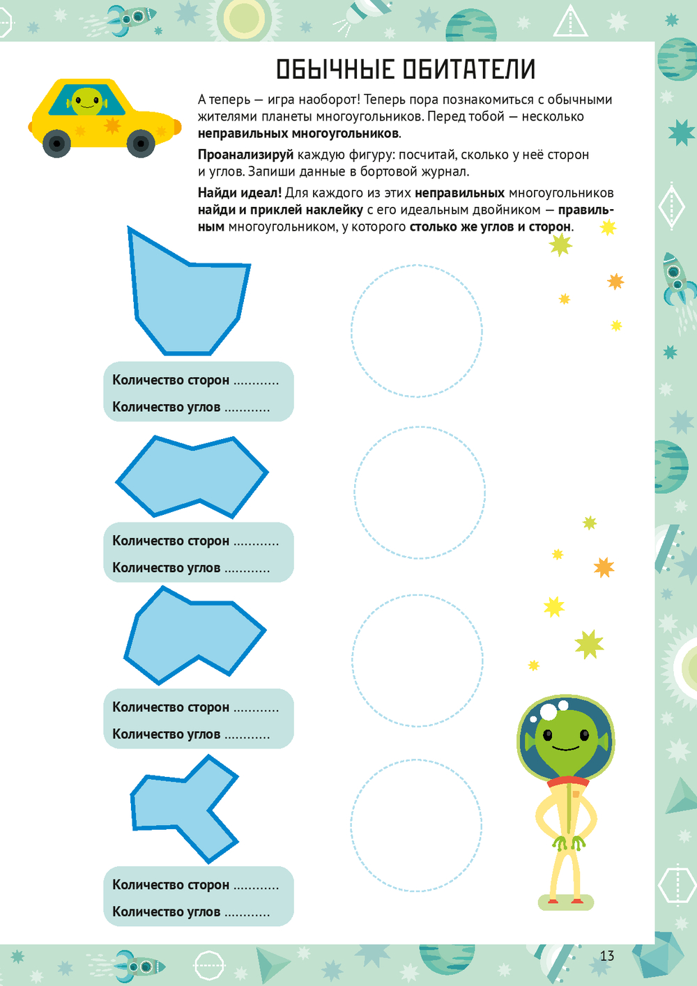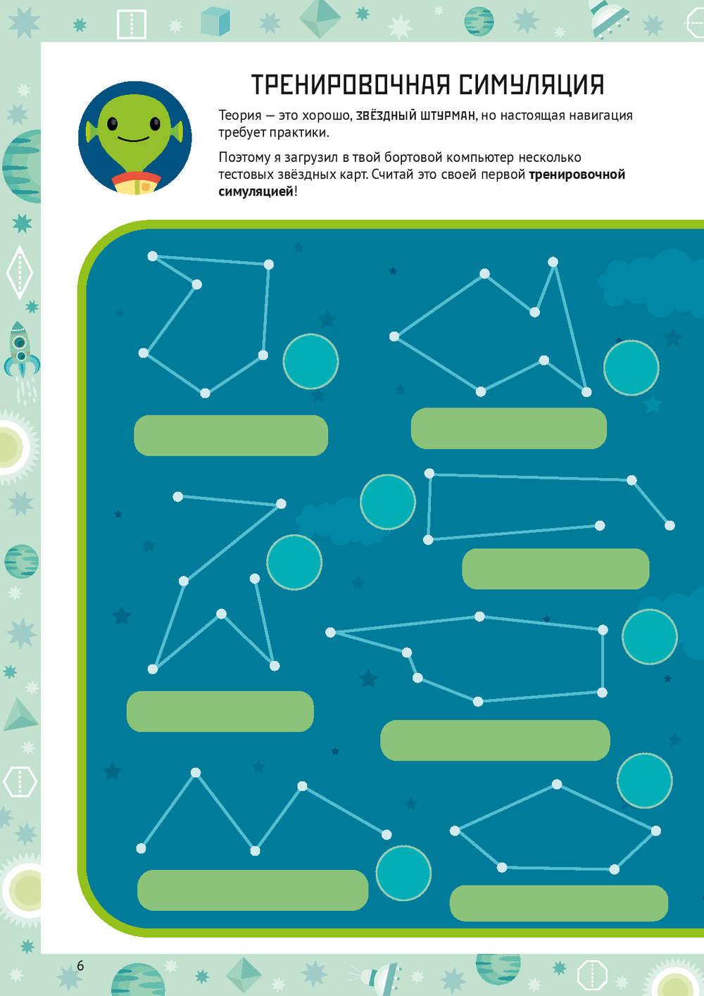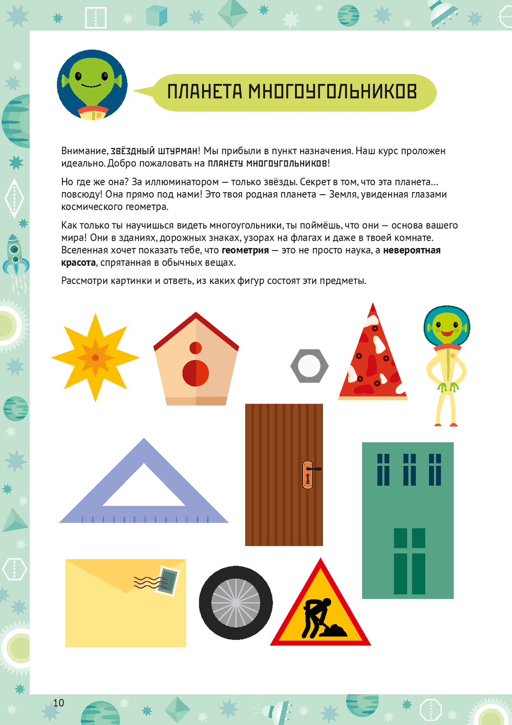 Каждая глава – это миссия на новой планете: нужно прокладывать курс между звёздами-точками, исследовать планету Многоугольников, строить объёмные планеты-кристаллы из развёрток, расшифровывать послания из квадранта Дельта-Гамма и даже чинить гигантский механизм из шестерёнок.