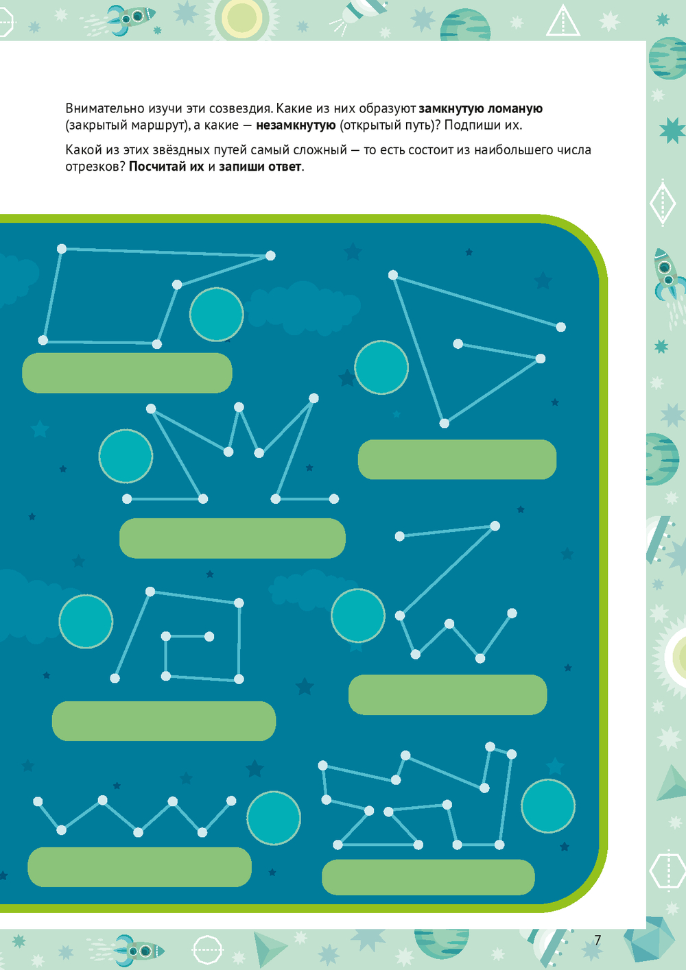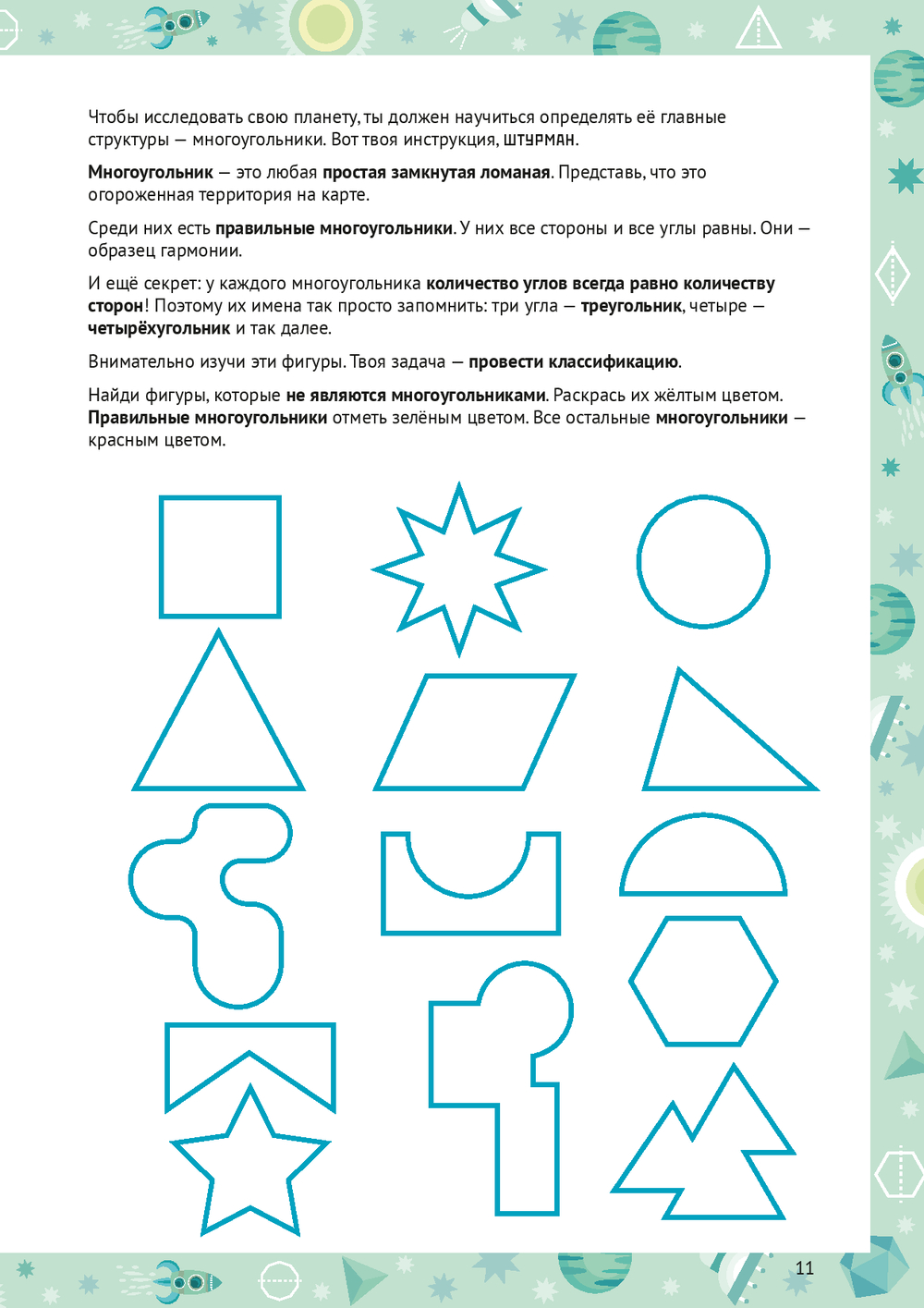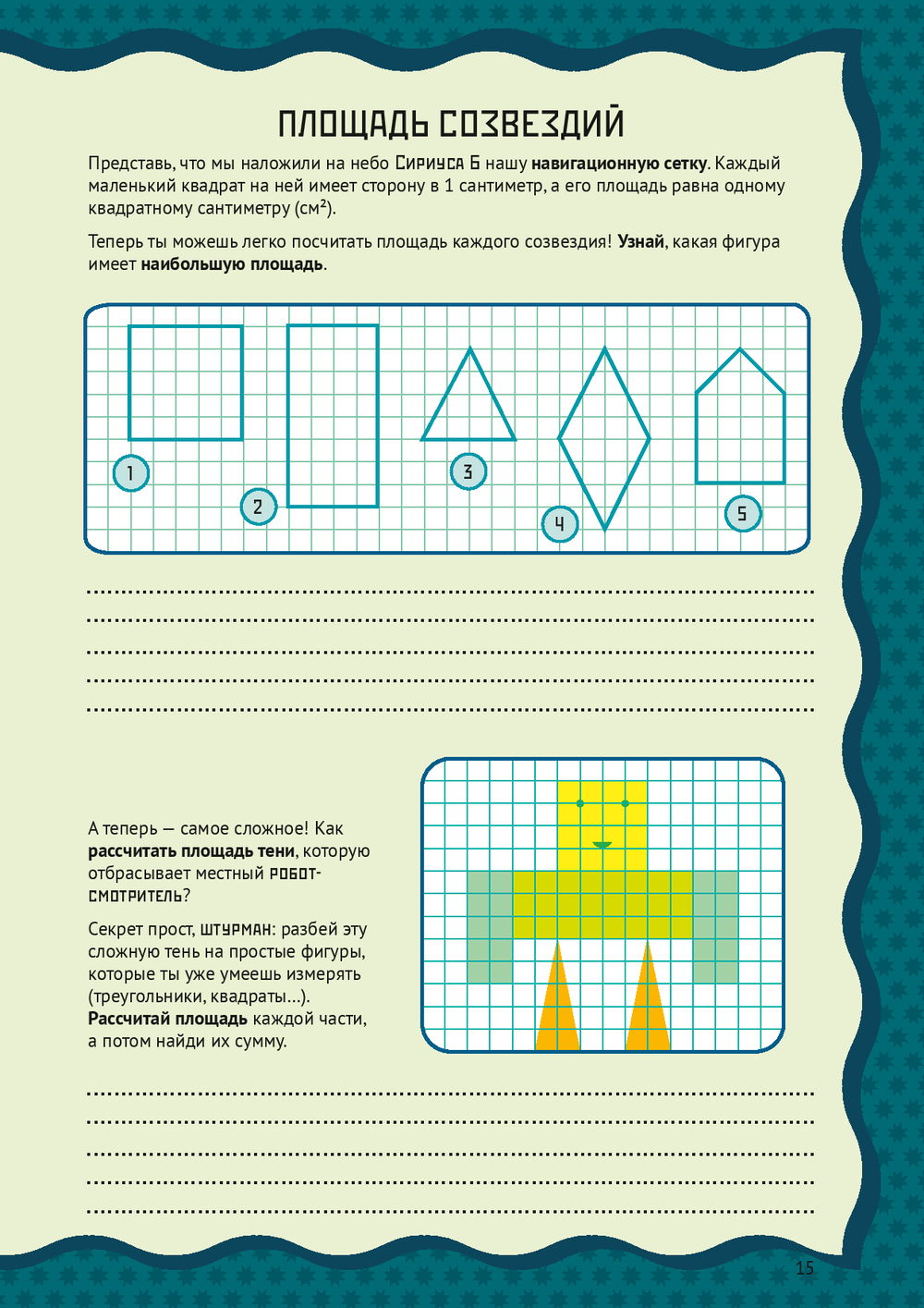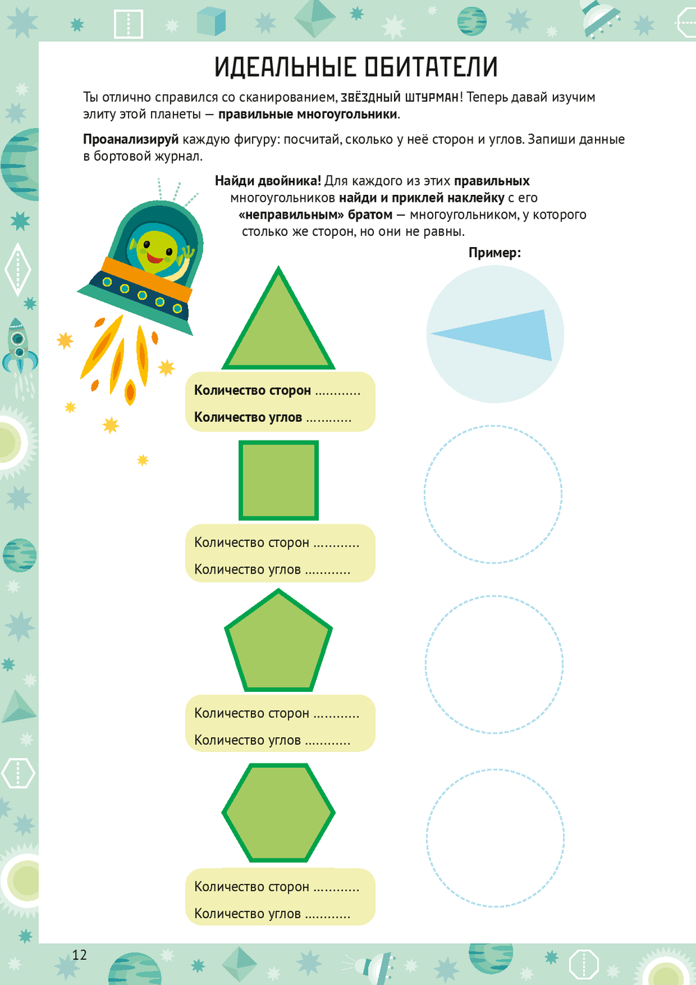 Каждая глава – это миссия на новой планете: нужно прокладывать курс между звёздами-точками, исследовать планету Многоугольников, строить объёмные планеты-кристаллы из развёрток, расшифровывать послания из квадранта Дельта-Гамма и даже чинить гигантский механизм из шестерёнок.