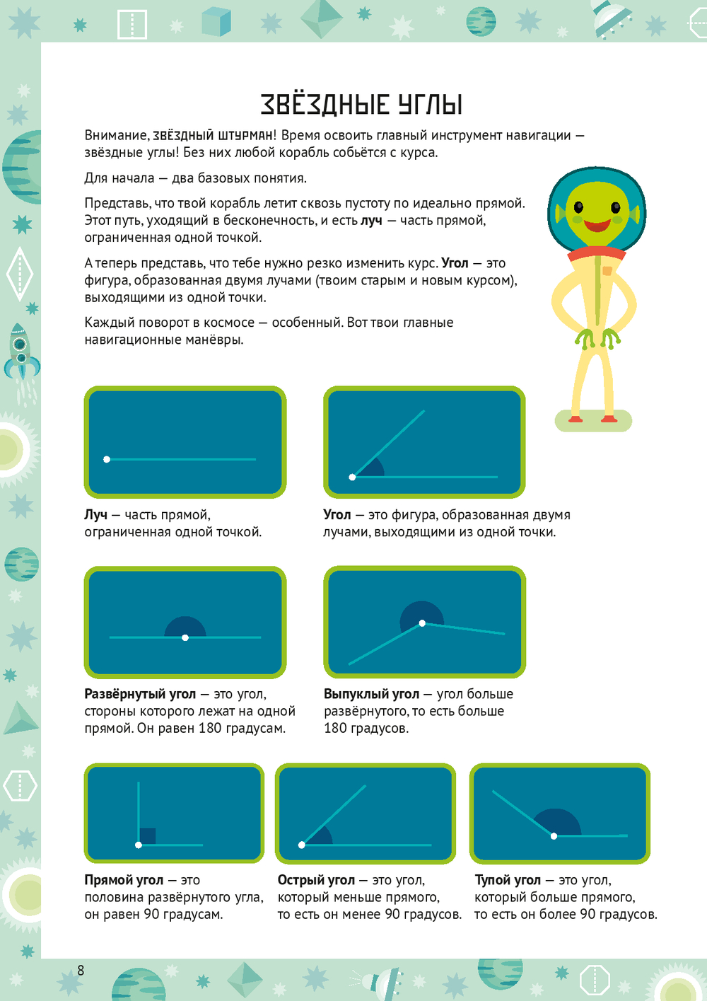 Тетрадь построена как космическое путешествие. Ребёнок примерит на себя роль звёздного штурмана и вместе с гидом-инопланетянином Рэем отправится исследовать дальние уголки космоса.