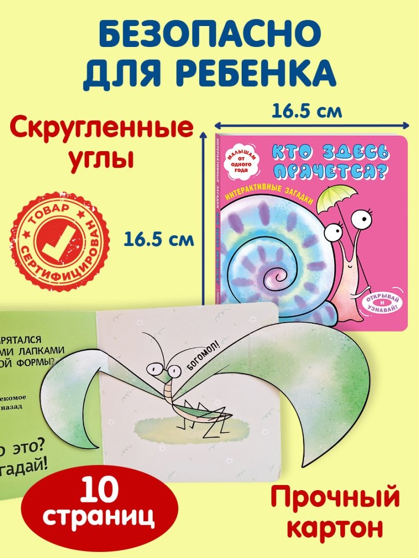 Интерактивная книга-загадка для малышей! Загляните под объёмные элементы – крылья, ушки или лапки – и познакомьтесь с обитателями животного мира! Эта красочно оформленная книжка-картинка превращает чтение в увлекательную игру: малыш может сам открыть створку, чтобы узнать верный ответ на загадку и увидеть, кто же прячется на страничке. А это… пчёлка, улитка, бабочка и другие интересные животные!