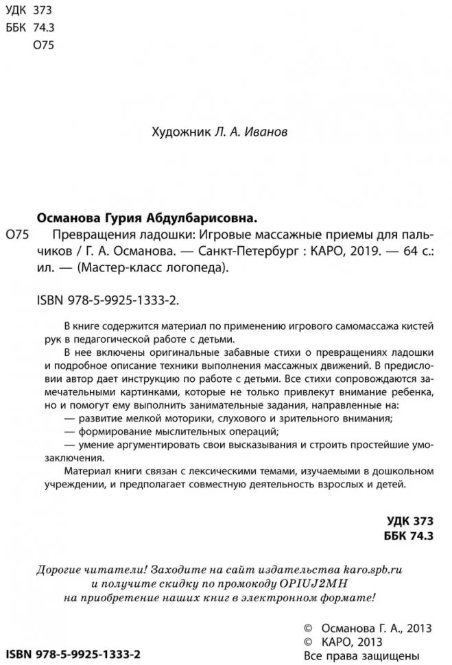 В нее включены оригинальные забавные стихи о превращениях ладошки и подробное описание техники выполнения массажных движений.