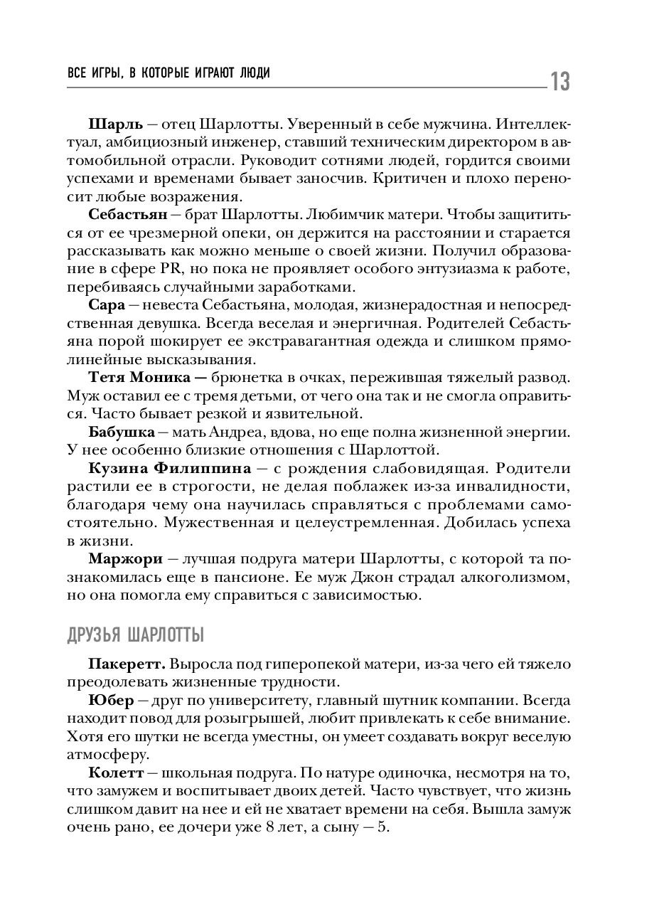 Перед вами – полное собрание описаний Эго-состояний, созданных Эриком Берном. Вместо сухой теории вы познакомитесь с реальной парой, их родителями, коллегами и друзьями. Через истории, диалоги, комментарии экспертов вы узнаете, как говорит и ведет себя человек в роли ребенка, взрослого или родителя. Шаг за шагом вы разберетесь в теории транзактного анализа и освободитесь от навязанных и ненужных сценариев и установок.