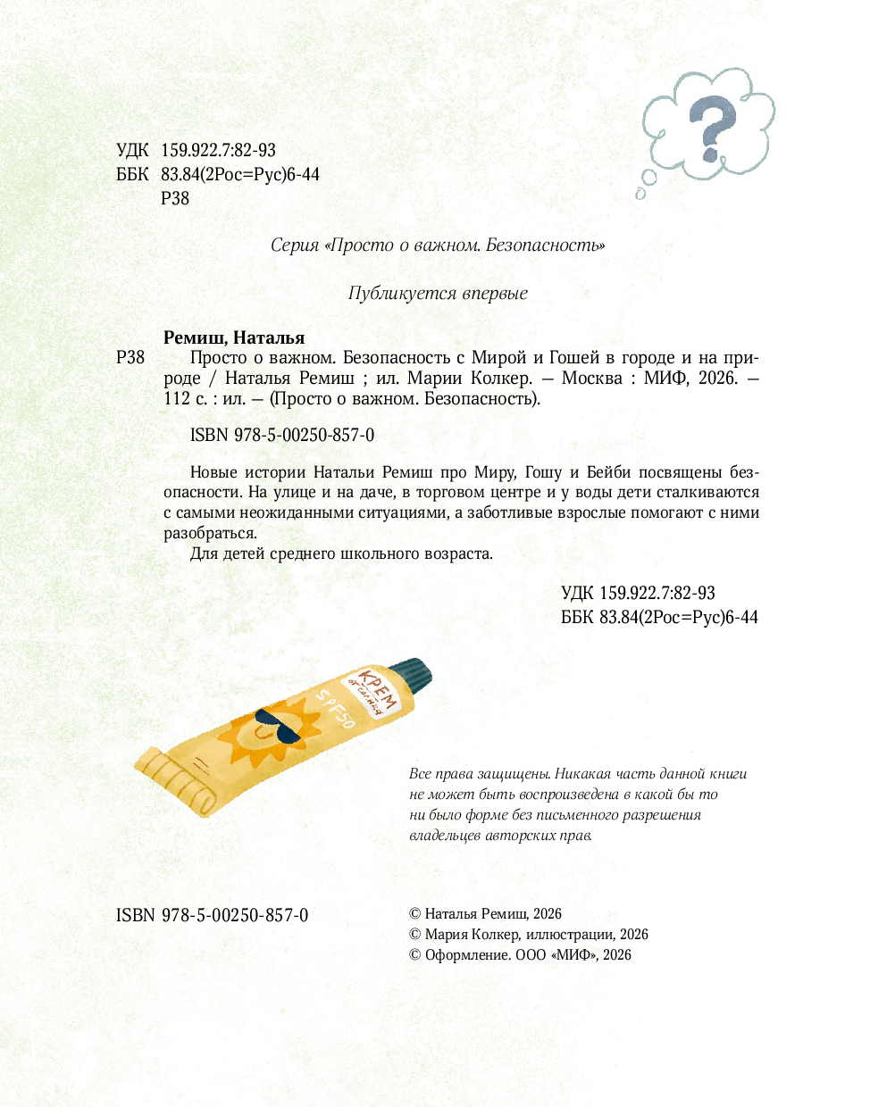 Новые истории Натальи Ремиш про Миру, Гошу и Бейби посвящены безопасности. На улице и на даче, в торговом центре и у воды они сталкиваются с самыми неожиданными ситуациями, а заботливые взрослые помогают с ними разобраться. Вопросы после каждой главы дадут родителям возможность обсудить с детьми, как распознавать потенциальные опасности, как реагировать на них и как их избегать.