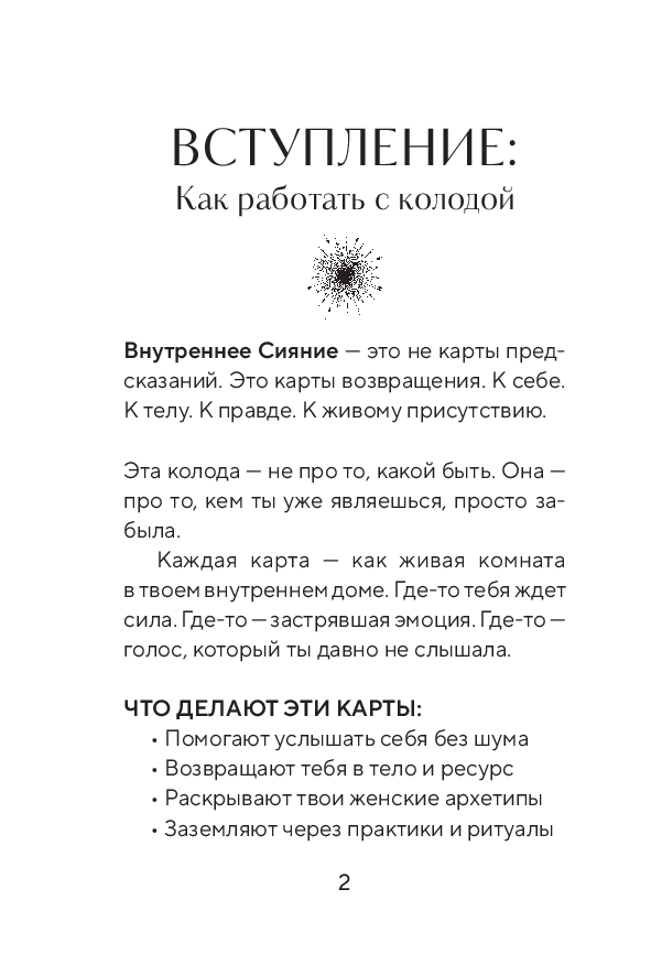 "Внутреннее Сияние. Карты женской силы" – это колода из 44 карт для женщин, которые готовы не просто вдохновляться, а проживать. Это инструмент возвращения к себе. К телу. К голосу. К истоку.