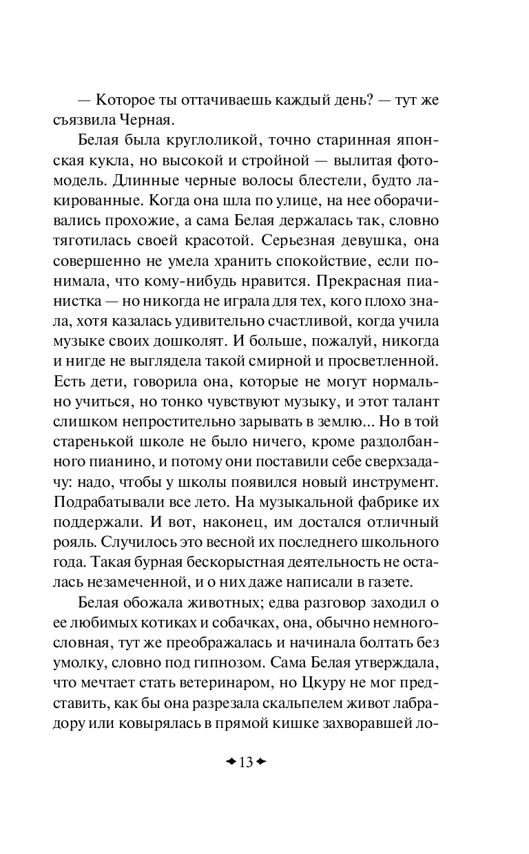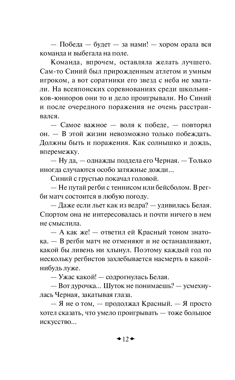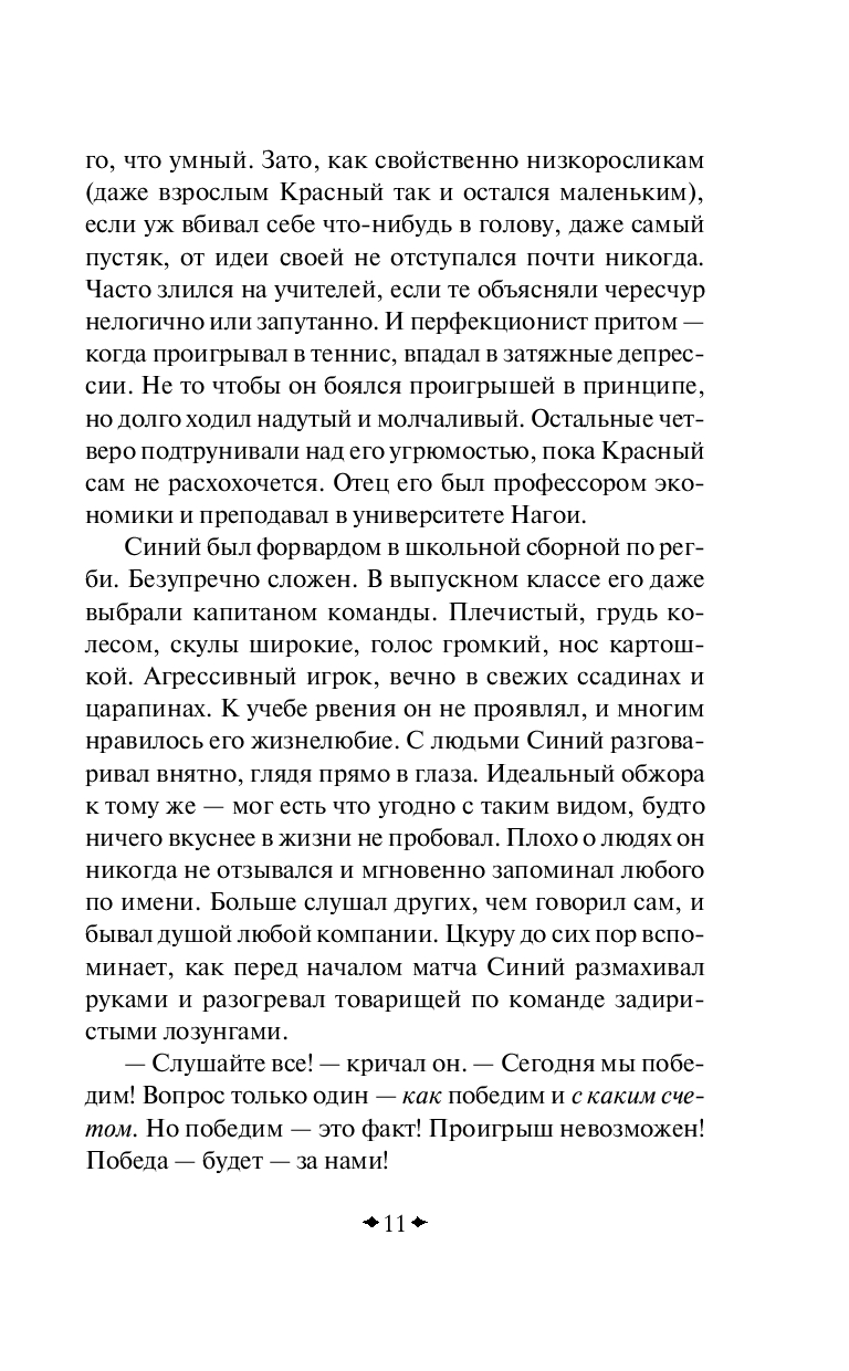 Они были всегда неразлучны. Красный, Синий, Белая, Черная и бесцветный Цкуру. На втором курсе университета что-то произошло. Четверка друзей оборвала все связи с Цкуру и больше не желала его видеть. С тех пор в его душе кровоточит рана, Белая и Черная периодически являются в эротических снах, а в жизни радует только работа.
