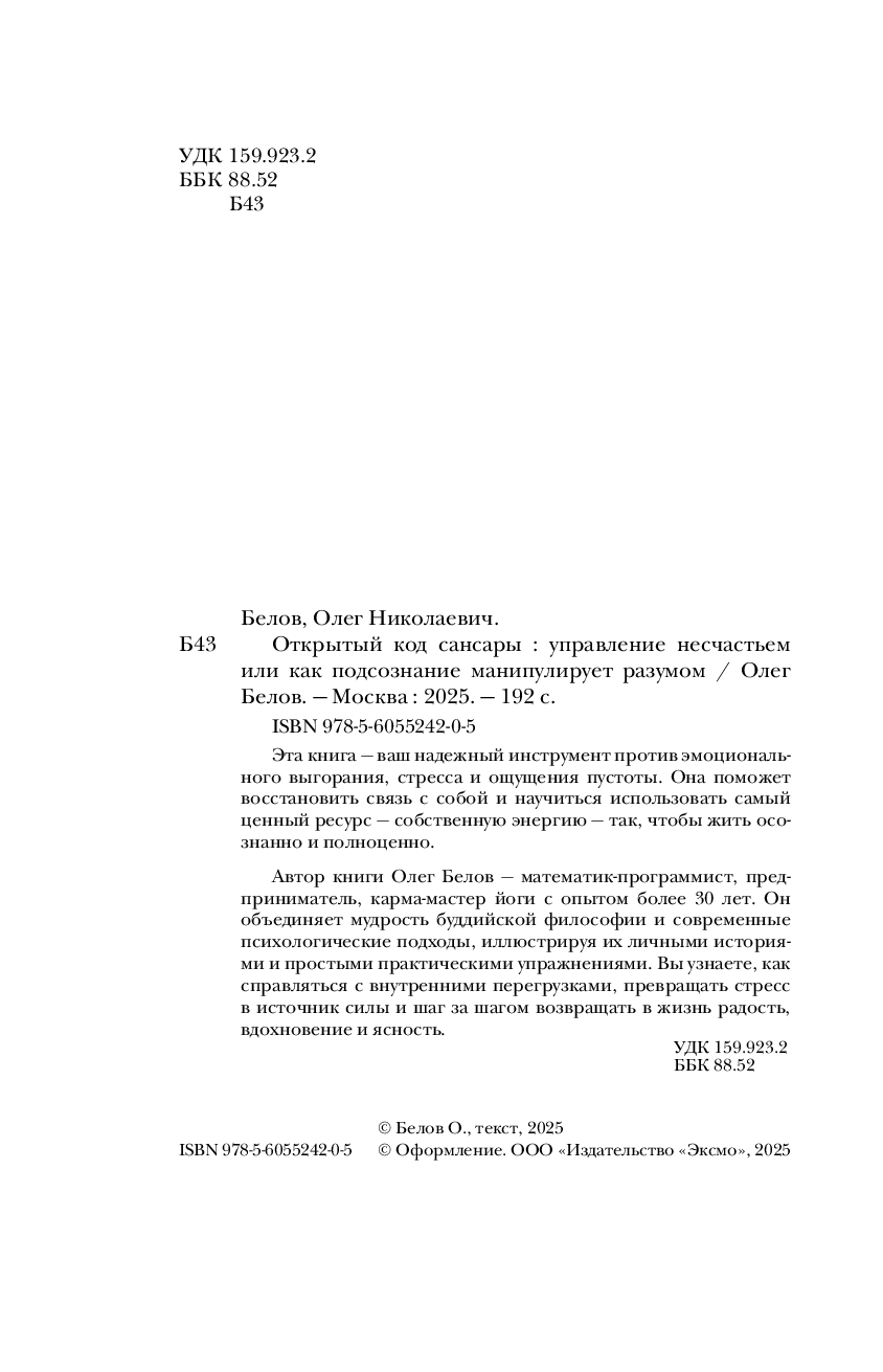 Автор книги Олег Белов математик-программист, предприниматель, карма-мастер йоги с опытом более 30 лет. Он объединяет мудрость буддийской философии и современные психологические подходы, иллюстрируя их личными историями и простыми практическими упражнениями. Вы узнаете, как справляться с внутренними перегрузками, превращать стресс в источник силы и шаг за шагом возвращать в жизнь радость, вдохновение и ясность.