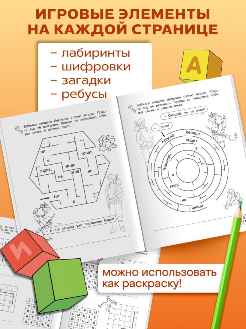Интерактивная рабочая тетрадь, разработанная практикующим нейропсихологом, поможет активизировать умственные способности и превратит обучение в увлекательное литературное путешествие. Занимаясь, дошкольник будет встречать любимых литературных героев и знакомиться с другими сказочными персонажами, которым понадобится его помощь. На каждой странице ребёнку предстоит проходить лабиринты, собирая по пути буквы и слова, решать ребусы, загадки и шифровки. Упражнения, собранные в книге, помогут развить точность и целостность зрительного восприятия образа буквы, автоматизировать навыки чтения, повысить внимание и улучшить мелкую моторику и логическое мышление.