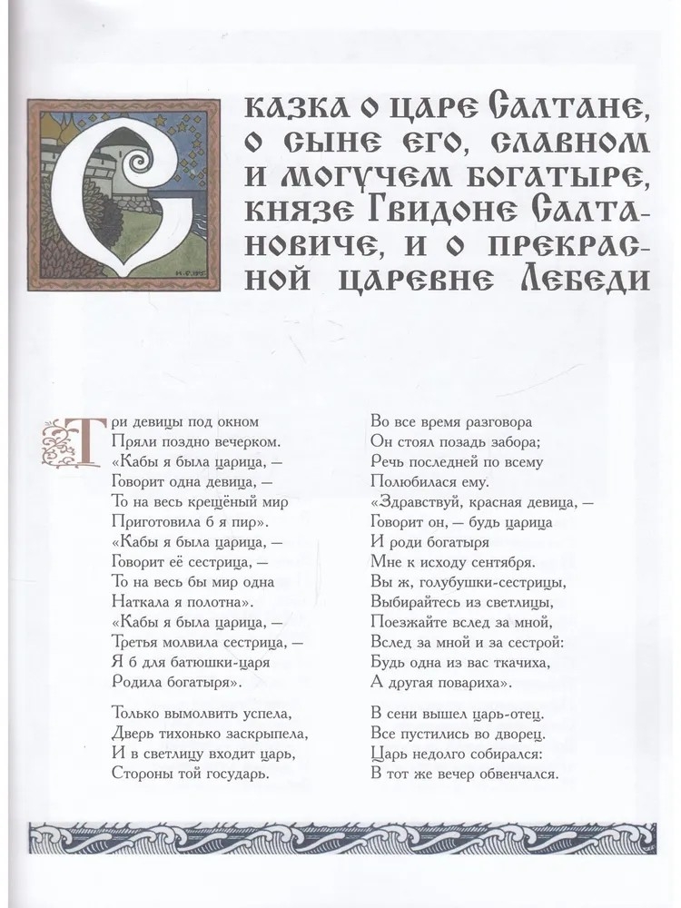 Дорогие читатели! Перед вами одна из сказок Александра Сергеевича Пушкина – "Сказка о царе Салтане", иллюстрации к которой выполнил замечательный русский художник Иван Яковлевич Билибин (1876–1942). Страстное увлечение Билибина старинным русским искусством отразилось в его иллюстрациях к пушкинским сказкам: к "Сказке о царе Салтане", "Сказке о золотом петушке", "Сказке о рыбаке и рыбке".