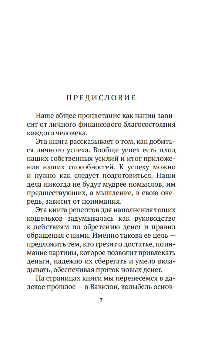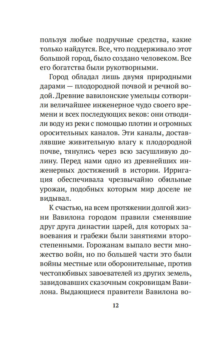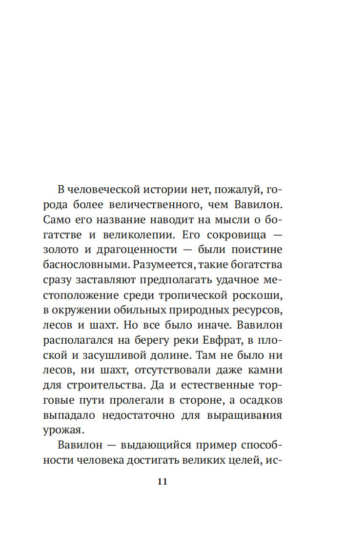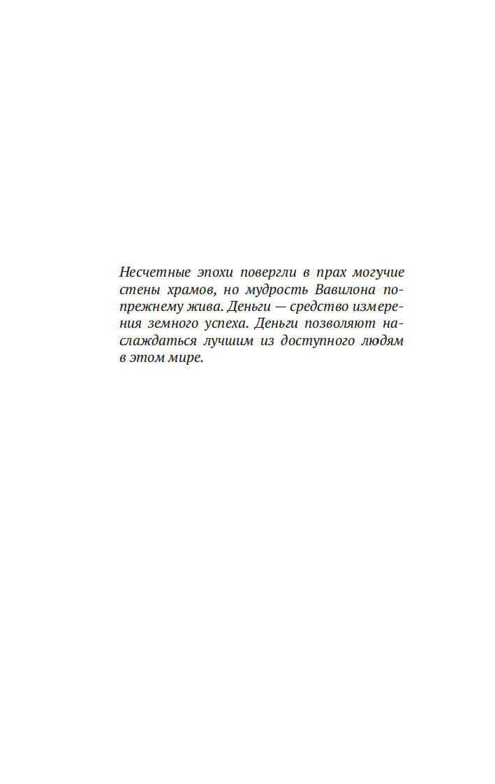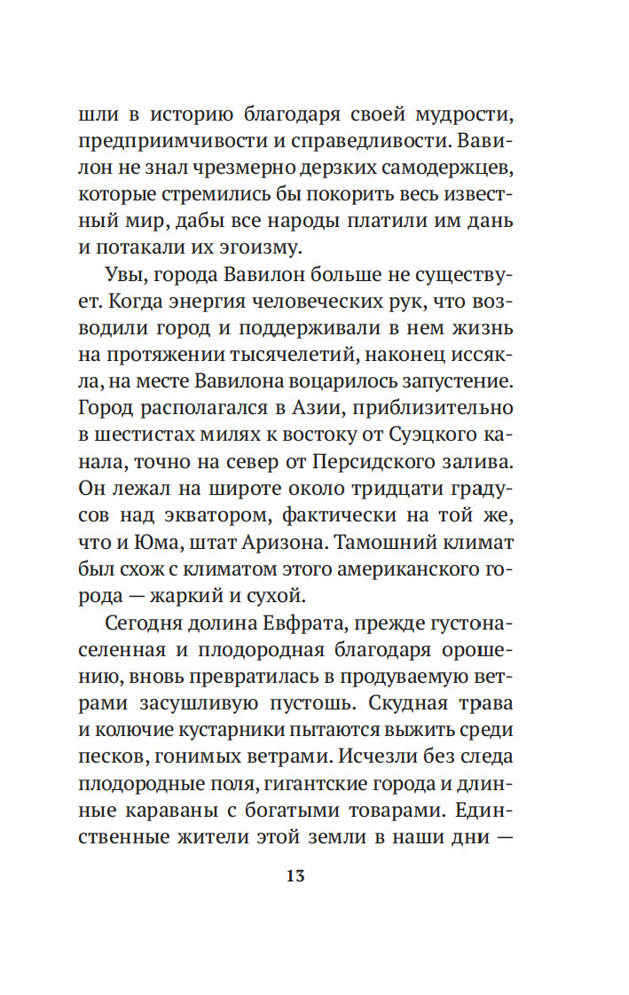 Вместе с погонщиками, ткачами, пастухами и другими жителями древнего Вавилона, ищущими мудрости и богатства, читатель становится свидетелем успеха некогда бедного писца, а теперь богача Аркада и извлекает из его жизненного опыта семь важных уроков о том, как грамотно "сколотить" состояние. Эта и множество других поучительных историй повествуют об универсальных законах обращения с деньгами, которые помогут сохранить и приумножить накопленные средства. Книга публикуется в новом переводе.