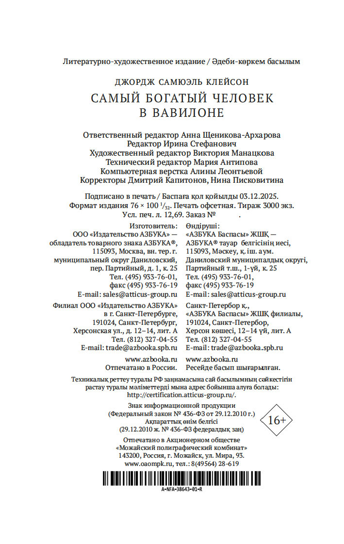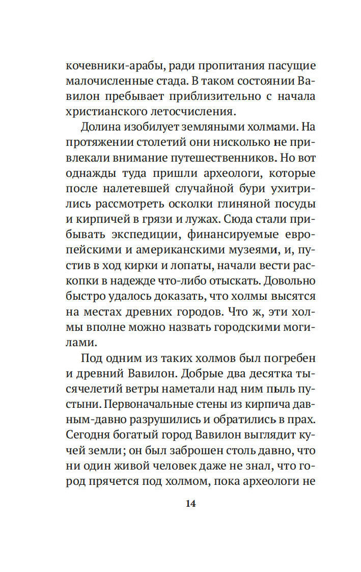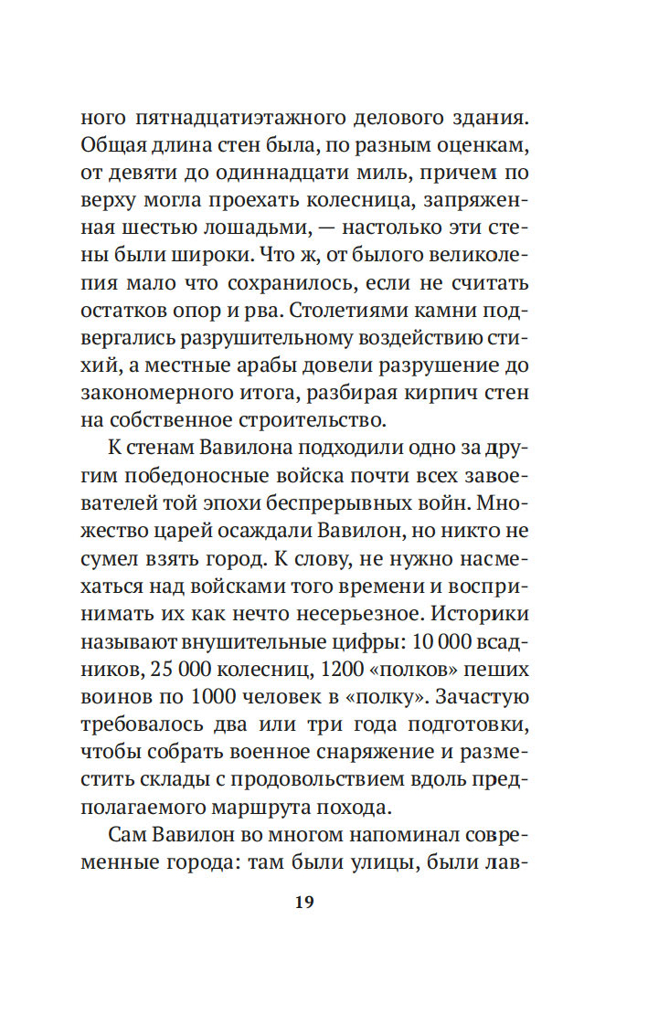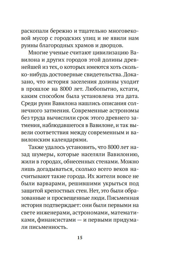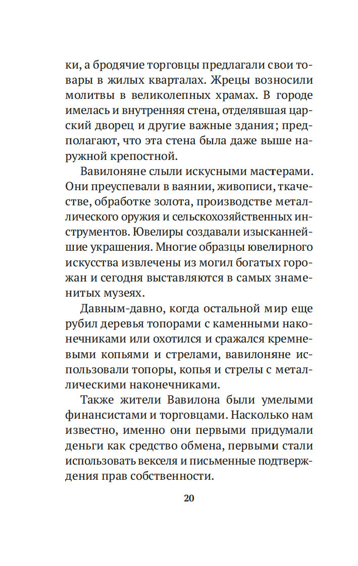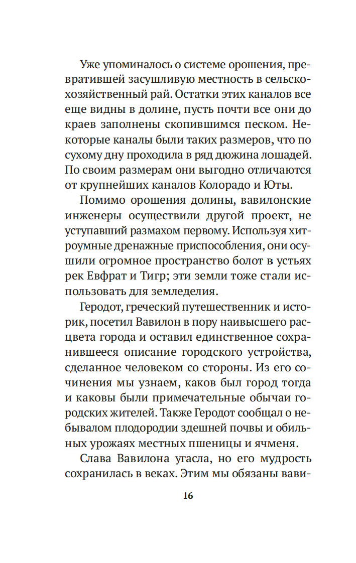 Вместе с погонщиками, ткачами, пастухами и другими жителями древнего Вавилона, ищущими мудрости и богатства, читатель становится свидетелем успеха некогда бедного писца, а теперь богача Аркада и извлекает из его жизненного опыта семь важных уроков о том, как грамотно "сколотить" состояние. Эта и множество других поучительных историй повествуют об универсальных законах обращения с деньгами, которые помогут сохранить и приумножить накопленные средства. Книга публикуется в новом переводе.