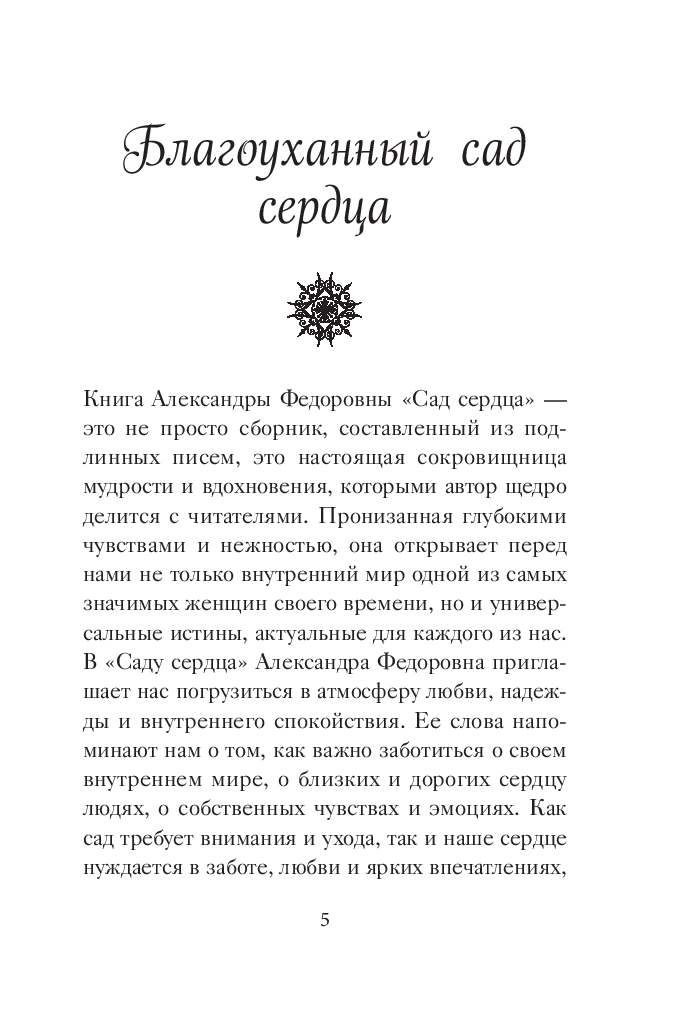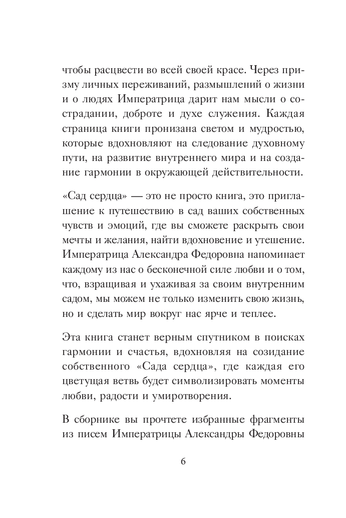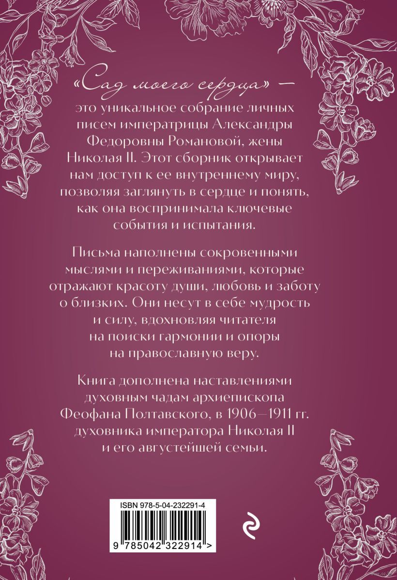 "Сад сердца" – это уникальное собрание личных писем Императрицы Александры Федоровны Романовой, жены Николая II. Этот сборник открывает нам доступ к её внутреннему миру, позволяя заглянуть в сердце и понять, как она воспринимала ключевые события и испытания. Письма наполнены сокровенными мыслями и переживаниями, которые отражают красоту души , любовь и заботу о близких. Они несут в себе мудрость и силу, вдохновляя читателя на поиски гармонии и опоры на православную веру.