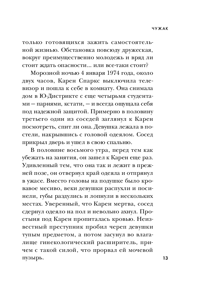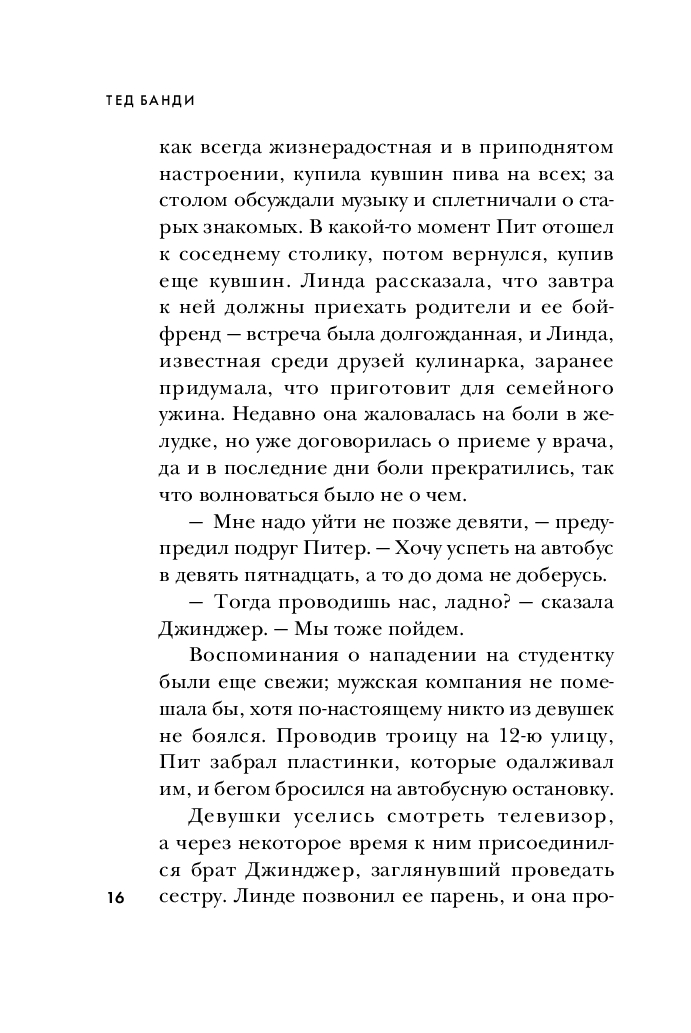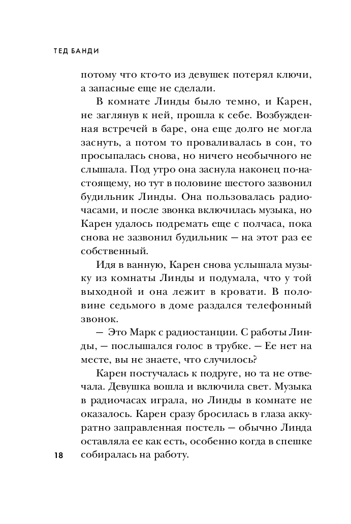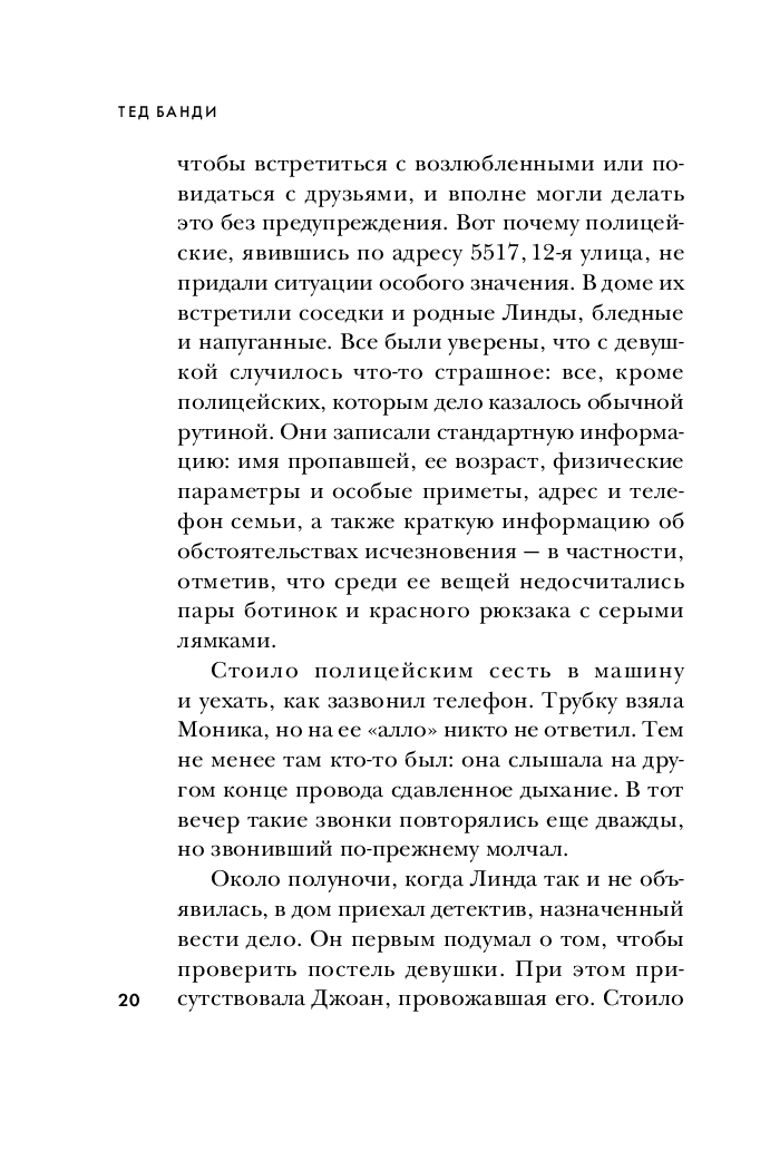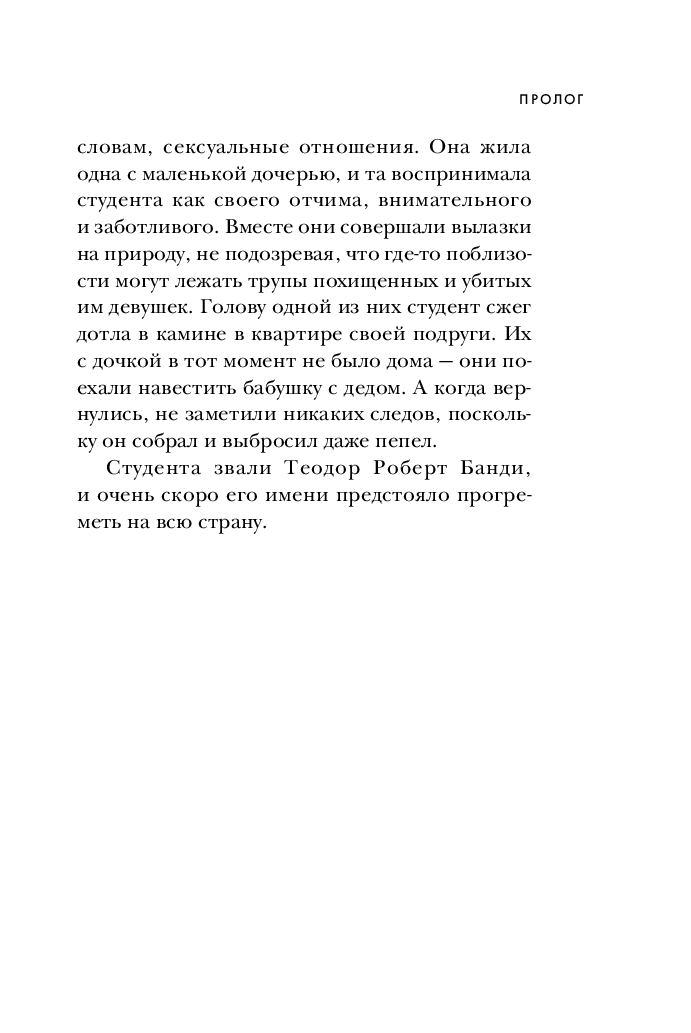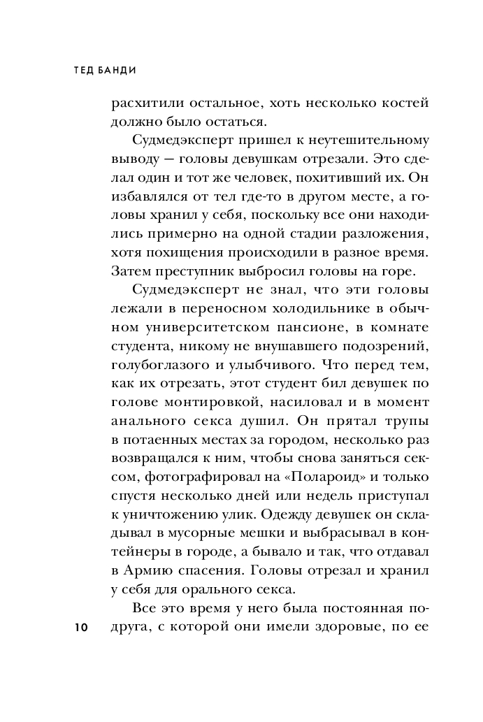 Эта книга, основанная на уникальных материалах – воспоминаниях его невесты, десятках личных часов бесед с самим Банди, и документах по его делу, – раскрывает подробности, неизвестные прежде. Почему следователи по делу Убийцы с Грин-Ривер обращались к Банди за консультацией и чем он им помог? Как ему удавалось годами уходить от правосудия и дважды сбежать из тюрьмы? Что он делал с телами убитых девушек? Сотрудничала ли его невеста с полицией? Увлекательная и шокирующая, эта книга впервые рассказывает полную историю маньяка-некрофила, ставшего синонимом серийного убийства.