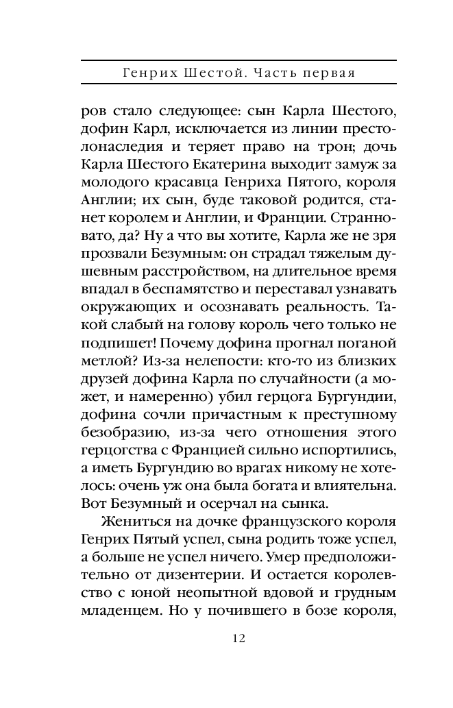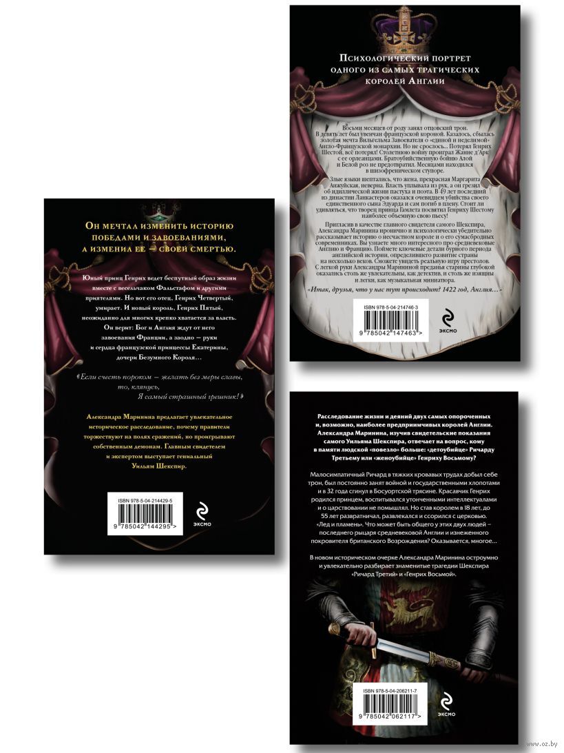 Пригласив в качестве главного свидетеля самого Шекспира, Александра Маринина иронично и психологически убедительно рассказывает истории о заговорах коварных претендентов на трон и предательствах королевских друзей, победах над своими и чужими подданными, поражениями венценосных героев в борьбе с пороками и безумием. С ее легкой руки преданья старины глубокой оказались столь же увлекательны как детектив, и столь же изящны и легки как музыкальная миниатюра. Увлекательная панорама английской истории: от избранника Фортуны Генриха Четвертого до любвеобильного Генриха Восьмого. Удивительно, насколько современными кажутся мотивы поступков шекспировских героев в пересказе Александры Марининой, которая вместе с гениальным драматургом задается вопросом: почему правители торжествуют на полях сражений, но проигрывают собственным демонам.