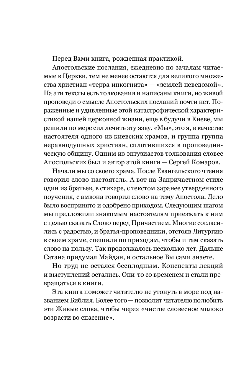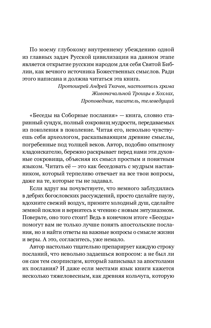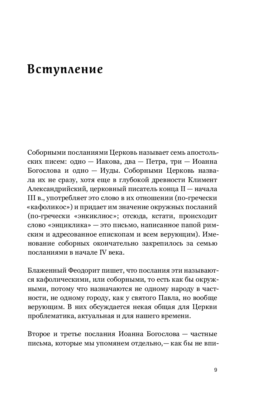 Семь посланий Нового Завета, именуемых "соборные" – послание апостола Иакова, два послания апостола Петра, три послания апостола Иоанна, послание Иуды – являются неотьемлемой частью Библии. Они оказали значительное влияние на развитие христианского богословия. Однако эти тексты, ежедневно по зачалам читаемые в Церкви, остаются малопонятными даже для воцерковленных христиан. Книга Сергея Комарова на высоком уровне говорит об особенностях каждого из семи соборных посланий, раскрывает их богословскую и нравственную проблематику, и находит в них темы, актуальные для современных людей. Она написана живым и доступным языком, понятным для широкой читательской аудитории. Сергею Комарову удается сочетать популярную манеру изложения с содержательной глубиной, в том числе, благодаря обращению к толкованиям святых отцов Православной Церкви.