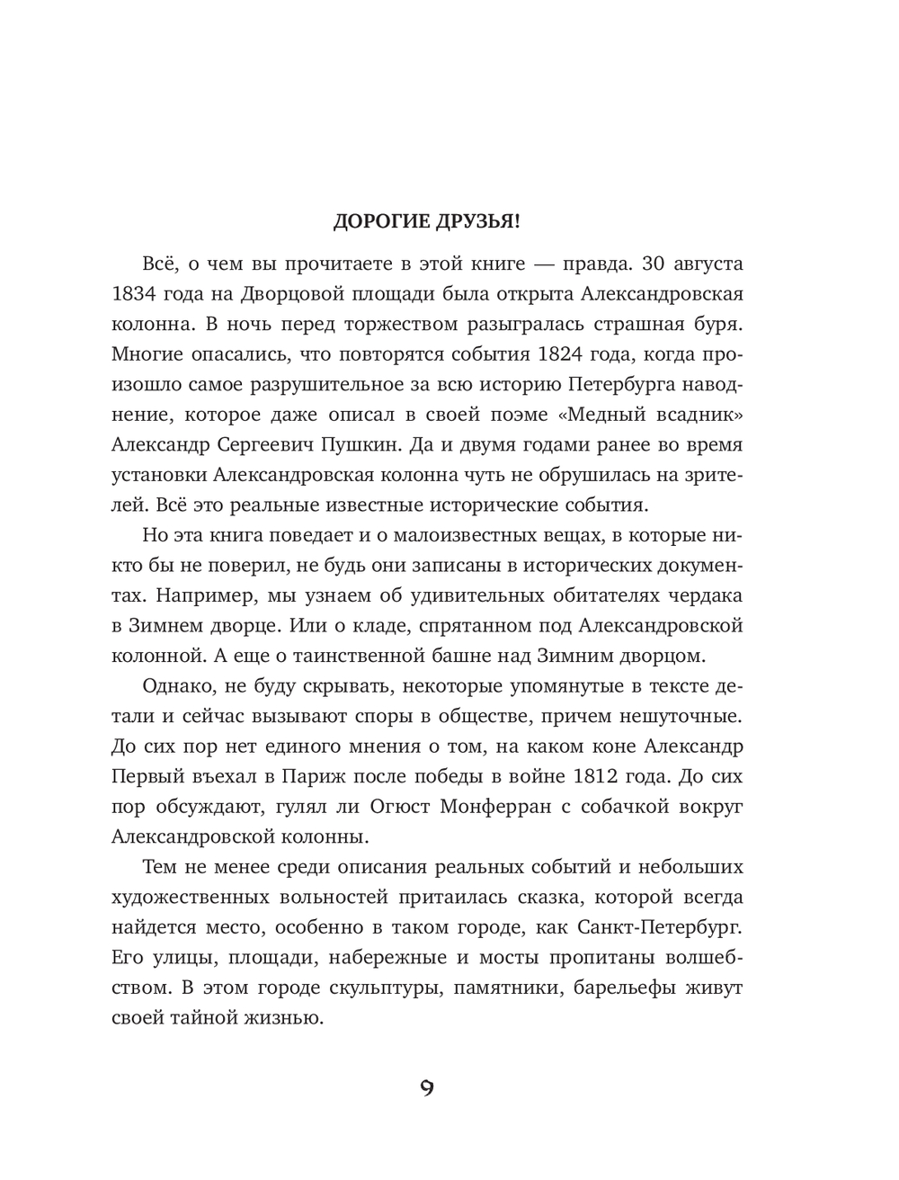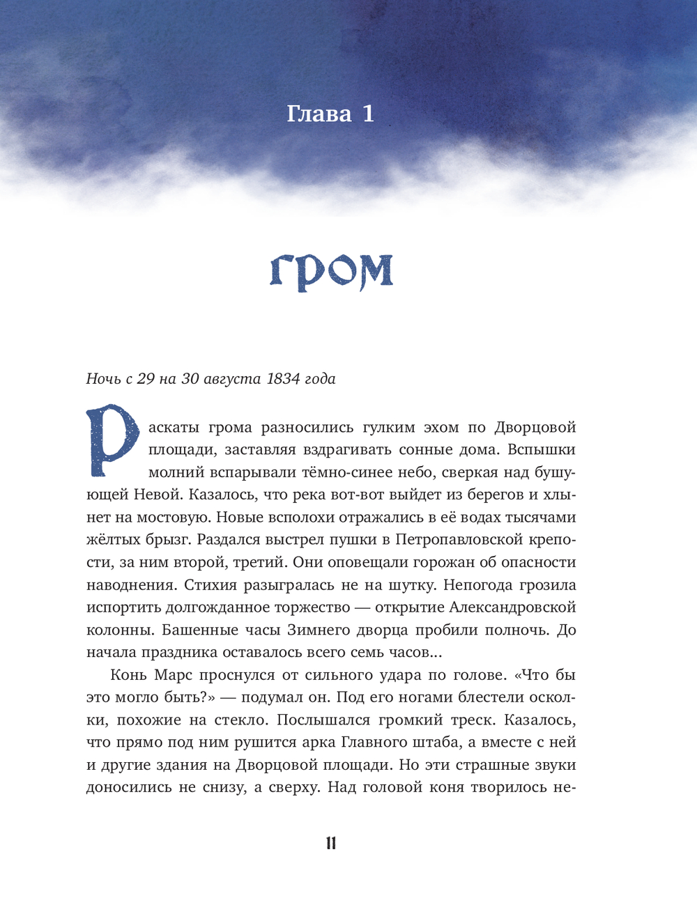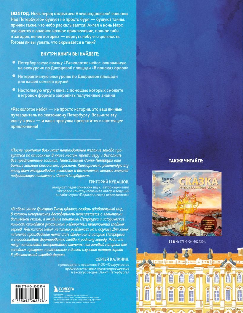 Сказка "Расколотое небо" – вторая книга автора Григория Ткача, основанная на его экскурсии "В поисках орлов". Вместе с Ангелом и конем Марсом вы пуститесь в захватывающее ночное приключение по улицам Петербурга: познакомитесь с тайными обитателями чердаков Зимнего дворца, найдете клад под Александровской колонной, посетите загадочную башню, узнаете, почему же небо раскололось и спасете его!