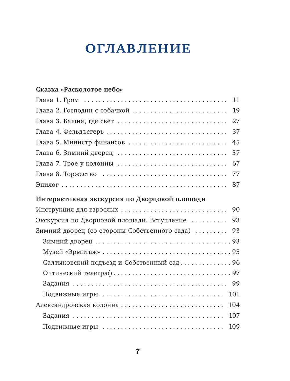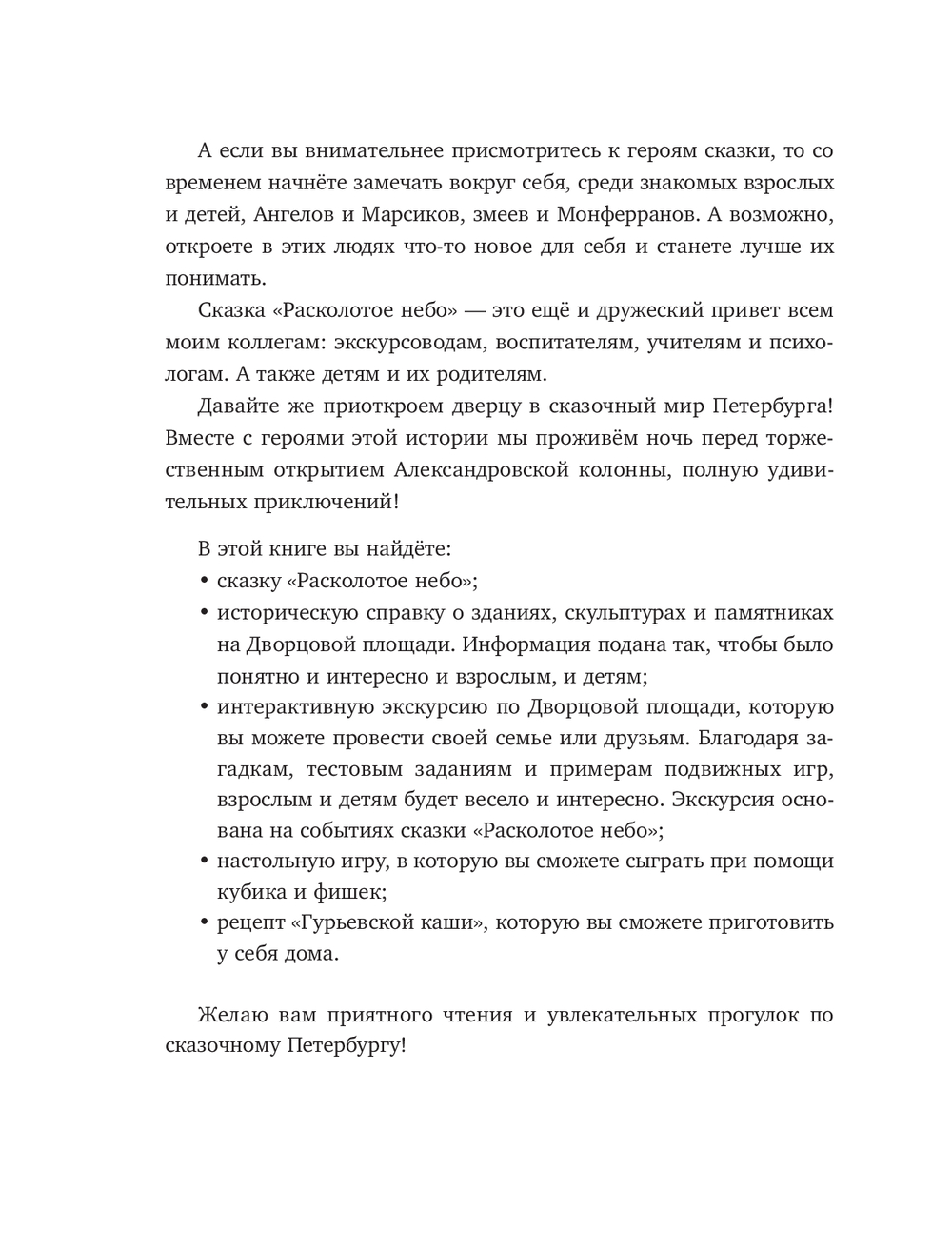 Волшебная иллюстрированная история о прогулках по Петербургу. "Расколотое небо" – сказка, которая оживляет город. В книге вы найдете не просто повествование на стыке времени и волшебства, но и станете его частью с помощью исторических справок, готовой экскурсии, квиза, настольной игры и даже рецепта старинного блюда – "Гурьевской каши". Идеально для семейного чтения и изучения Петербурга с новой, магической стороны.