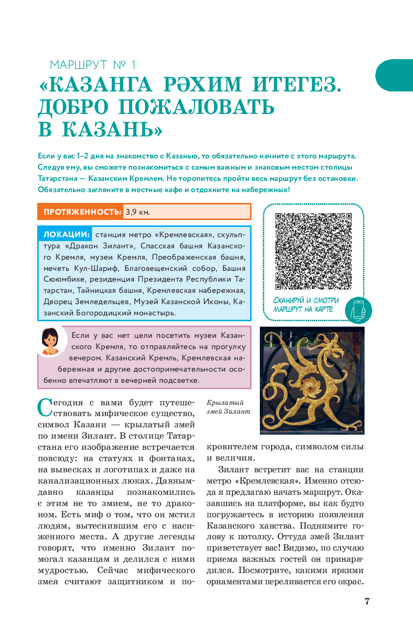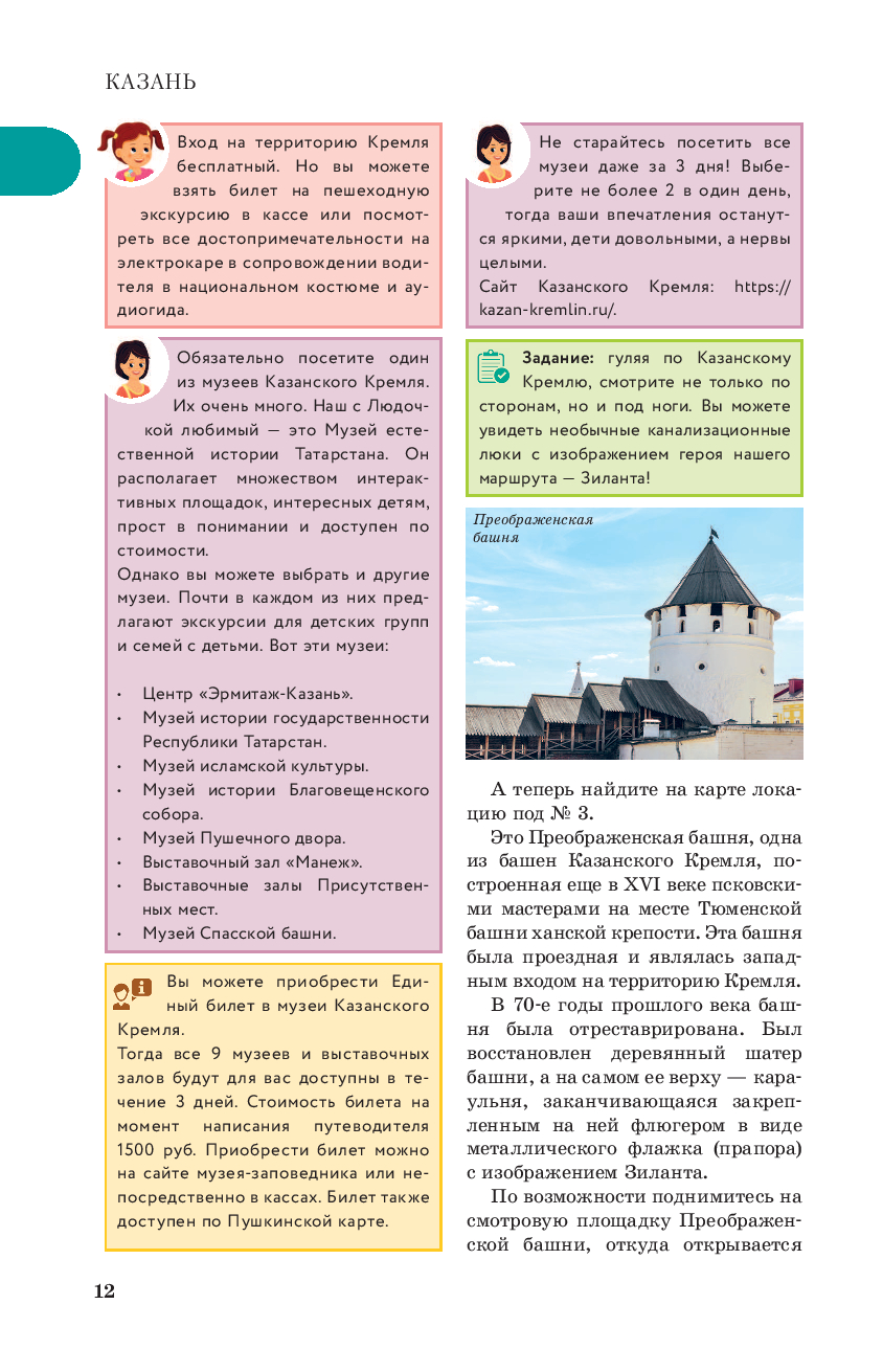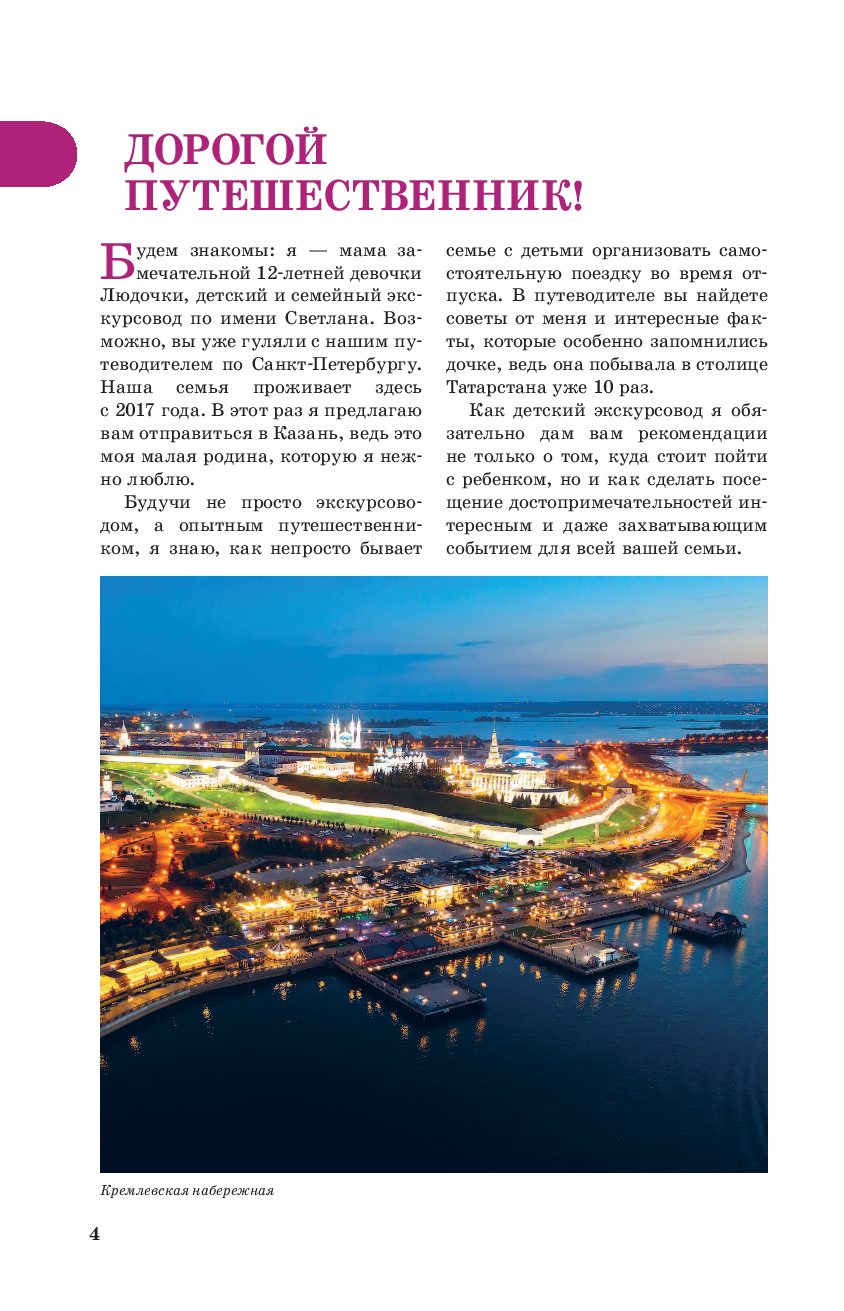 Семейный путеводитель по Казани, разработанный семейным экскурсоводом Светланой совместно с ее дочерью Людочкой, приглашает родителей и детей погрузиться в удивительное путешествие по столице Татарстана. В этом путеводителе вы найдете рекомендации о том, как сделать семейное приключение интересным, и, конечно, получите от нас ответы на вопросы: где разместиться, в каких местах пообедать, что посмотреть. А еще об объектах в путеводителе вы найдете увлекательные истории, которые можно рассказать детям во время путешествия. Полезные советы будет давать мама Светлана, а с интересными фактами познакомит читателя Людочка. QR-коды, размещенные перед каждой главой с маршрутом, ведут на страницы с картой в интернете, что поможет вам заранее спланировать поездку. Вас ждут яркие эмоции, новые знания и приятные воспоминания.